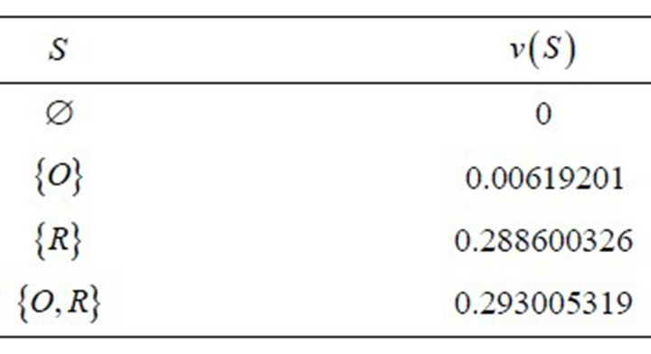 The next table shows the marginal contributions for the previous game and the Shapley value for it: