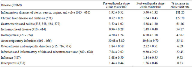 Table 5 showed the major weekly clinic visit rate of the 2486 persons before and after the Chi-Chi earthquake in Puli township. The greatest weekly clinic visit rate before the Chi-Chi earthquake was acute respiratory infections (30.08 ± 8.80 visits/100 population), follow by infections and inflammatory of skin and subcutaneous (7.84 ± 2.02 visits/100 population), and dorsopathies (4.20 ± 1.24 visits/100 population). Correspondingly, the greatest weekly clinic visit rate after the Chi-Chi earthquake was acute respiratory infections (40.64 ± 9.70 visits/100 population), follow by infections and inflammatory of skin and subcutaneous (9.60 ± 2.92 visits/100 population), and dorsopathies (6.20 ± 1.78 visits/100 population). The greatest increased percentage in weekly clinic visit rate resulted from the Chi-Chi earthquake was inflammatory diseases of uterus, cervix, vagina, and vulva (181.25%), followed by Chronic liver disease and cirrhosis (127.78%). The health effects were corresponded to the environmental exposures, complaints, and needs in the temporary housing.