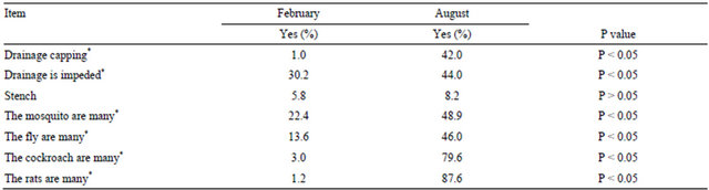 Ventilation is in many cases used to control the thermal environment or humidity in buildings [11]. The inadequate ventilation could increase interior temperature and moisture, which contribute to an increase in emission of volatile chemical [12]. Therefore, the indoor toilet built combined with the poor ventilation might explain the high concentration of ammonia in hot season in the study. The damp house provides a nurturing environment for mites, coaches, molds, fungi, respiratory bacteria, and virus all of which play a role in respiratory, skin, and vaginal disease pathogenesis of the housing residences [13-18]. The impeded drainage in out doors can harbor
