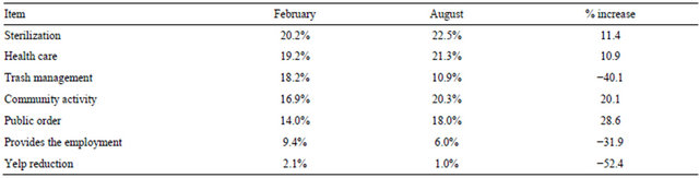 Table 4 shows the major need of health and safety for the temporary housing households. The major need reported by the first survey was sterilization (20.2%), followed by health care (19.2%), trash management (18.2%), community activity (16.9%), and public order (14%). By the second survey, the major need reported was sterilization (22.5%), followed by health care (21.3%), community activities (20.3%), and public order (18.0%). The greatest percentage of increase in the major need of