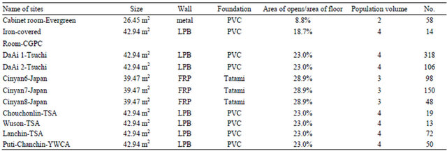 13 Wuson-TSA, 32 Taumi-TSA, 72 Lanchin-TSA, and 50 Chanchin-YWCA). All the sites were located outside of the city, and all the toilets were built in indoors except the Cainet room-Evergreen. The temporary houses were constructed on the farmland and with light materials, such as light partition board (LPB), fibre reinforced polymer (FRP), and poly vinyl chloride (PVC). The population volume was correlated with the housing sizes. The effective ventilated indies were not out of compass (≥5%) in all the temporary housing units, however, most of the windows were closed when we surveyed the temporary housing.