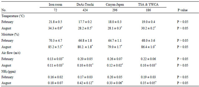 Making use of potable meters to measure the indoor air environment including thermal & moisture (Electronic thermal-hygrograph meter; TOMEL CO, Japan), air flow (Mini anemometer, model: ISA-6-3D; SIBATA, Japan), and ammonia level (PACⅡ; Drager CO, Germany). Meters were calibrated daily before data collection. The temporary housing sites were clustered into four construction types on the basis of occupancy permit by materials. They included Iron room (including cabinet room, and iron-covered room), DaAi-Tsuchi (including DaAi 1-Tsuchi, and DaAi 2-Tsuchi), Cinyan-Japan (including Cinyan6-Japan, Cinyan7-Japan, and Cinya8- Japan), and The salvation army & Young women’s Christian association (TSA& YWCA) (including Chou-chonlin-TSA, Wuson-TSA, Taumi-TSA, Lanchin-TSA, and Puti-Chanchin-YWCA). The first measurements were conducted in February (cold season) 2000, and the final measurements were conducted in August (hot season) 2000 for the 4 items of indoor air environment, respectively. The environmental data was taken from 09:00 to 16:00 in the both measure periods.