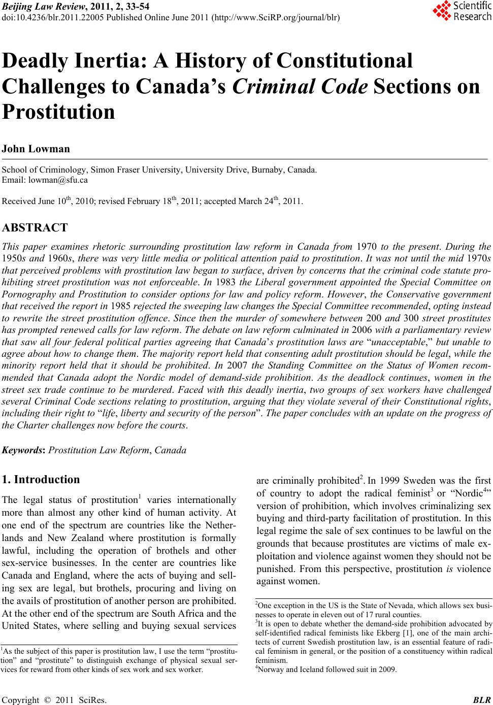 Beijing Law Review, 2011, 2, 33-54 doi:10.4236/blr.2011.22005 Published Online June 2011 (http://www.SciRP.org/journal/blr) Copyright © 2011 SciRes. BLR 33 Deadly Inertia: A History of Constitutional Challenges to Canada’s Criminal Code Sections on Prostitution John Lowman School of Criminology, Simon Fraser University, University Drive, Burnaby, Canada. Email: lowman@sfu.ca Received June 10th, 2010; revised February 18th, 2011; accepted March 24th, 2011. ABSTRACT This paper examines rhetoric surrounding prostitution law reform in Canada from 1970 to the present. During the 1950s and 1960s, there was very little media or political attention paid to prostitution. It was not until the mid 1970s that perceived problems with prostitution law began to surface, driven by concerns that the criminal code statute pro- hibiting street prostitution was not enforceable. In 1983 the Liberal government appointed the Special Committee on Pornography and Prostitution to consider options for law and policy reform. However, the Conservative government that received the report in 1985 rejected the sweeping law changes the Special Committee recommended, opting instead to rewrite the street prostitution offence. Since then the murder of somewhere between 200 and 300 street prostitutes has prompted renewed calls for law reform. The debate on law reform culminated in 2006 with a parliamentary review that saw all four federal political parties agreeing that Canada’s prostitution laws are “unacceptable,” but unable to agree about how to chang e them. The majority report held that co nsenting adult prostitution sh ould be legal, while the minority report held that it should be prohibited. In 2007 the Standing Committee on the Status of Women recom- mended that Canada adopt the Nordic model of demand-side prohibition. As the deadlock continues, women in the street sex trade continue to be murdered. Faced with this deadly inertia, two groups of sex workers have challenged several Criminal Code sections relating to prostitution, arguing that they violate several of their Constitutional rights, including their right to “life, liberty and security of the person”. The pap er concludes with an update on th e progress of the Charter challenges now before the courts. Keywords: Prostitution Law Reform, Canada 1. Introduction The legal status of prostitution1 varies internationally more than almost any other kind of human activity. At one end of the spectrum are countries like the Nether- lands and New Zealand where prostitution is formally lawful, including the operation of brothels and other sex-service businesses. In the center are countries like Canada and England, where the acts of buying and sell- ing sex are legal, but brothels, procuring and living on the avails of prostitution of another person are prohibited. At the other end of the spectrum are South Africa and the United States, where selling and buying sexual services are criminally prohibited2. In 1999 Sweden was the first of country to adopt the radical feminist3 or “Nordic4” version of prohibition, which involves criminalizing sex buying and third-party facilitation of prostitution. In this legal regime the sale of sex continues to be lawful on the grounds that because prostitutes are victims of male ex- ploitation and violence against women they should not be punished. From this perspective, prostitution is violence against women. 2One exception in the US is the State of Nevada, which allows sex busi- nesses to operate in eleven out of 17 rural counties. 3It is open to debate whether the demand-side prohibition advocated by self-identified radical feminists like Ekberg [1], one of the main archi- tects of current Swedish prostitution law, is an essential feature of radi- cal feminism in general, or the position of a constituency within radical feminism. 4Norway and Iceland followed suit in 2009. 1As the subject of this paper is prostitution law, I use the term “prostitu- tion” and “prostitute” to distinguish exchange of physical sexual ser- vices for reward from other kinds of sex work and sex worker.