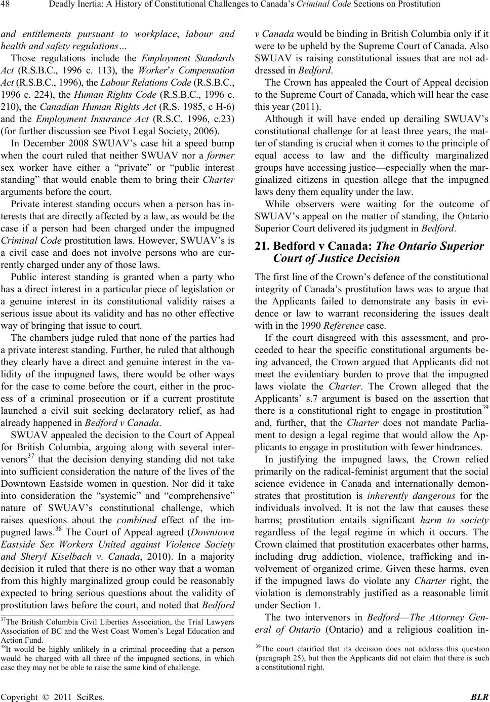 Deadly Inertia: A History of Constitutional Challenges to Canada’s Criminal Code Sections on Prostitution 48 and entitlements pursuant to workplace, labour and health and safety regulations… Those regulations include the Employment Standards Act (R.S.B.C., 1996 c. 113), the Worker’s Compensation Act (R.S.B.C., 1996), the Labour Relations Code (R.S.B.C., 1996 c. 224), the Human Rights Code (R.S.B.C., 1996 c. 210), the Canadian Human Rights Act (R.S. 1985, c H-6) and the Employment Insurance Act (R.S.C. 1996, c.23) (for further discussion see Pivot Legal Society, 2006). In December 2008 SWUAV’s case hit a speed bump when the court ruled that neither SWUAV nor a former sex worker have either a “private” or “public interest standing” that would enable them to bring their Charter arguments before the court. Private interest standing occurs when a person has in- terests that are directly affected by a law, as would be the case if a person had been charged under the impugned Criminal Code prostitution laws. However, SWUAV’s is a civil case and does not involve persons who are cur- rently charged und er any of those laws . Public interest standing is granted when a party who has a direct interest in a particular piece of legislation or a genuine interest in its constitutional validity raises a serious issue about its validity and has no other effective way of bringing that issu e to cour t. The chambers judge ruled that none of the parties had a private interest standing. Further, he ruled that although they clearly have a direct and genuine interest in the va- lidity of the impugned laws, there would be other ways for the case to come before the court, either in the proc- ess of a criminal prosecution or if a current prostitute launched a civil suit seeking declaratory relief, as had already happened in Bedford v Canada. SWUAV appealed the decision to the Court of Appeal for British Columbia, arguing along with several inter- venors37 that the decision denying standing did not take into sufficient consideration the nature of the lives of th e Downtown Eastside women in question. Nor did it take into consideration the “systemic” and “comprehensive” nature of SWUAV’s constitutional challenge, which raises questions about the combined effect of the im- pugned laws.38 The Court of Appeal agreed (Downtown Eastside Sex Workers United against Violence Society and Sheryl Kiselbach v. Canada, 2010). In a majority decision it ruled that there is no other way that a woman from this highly marginalized group could be reasonably expected to bring serious questions about the validity of prostitution laws before the court, and noted that Bedford v Canada would be binding in British Columbia only if it were to be upheld by the Supreme Court of Canada. Also SWUAV is raising constitutional issues that are not ad- dressed in Bedford. The Crown has appealed the Court of Appeal decision to the Supreme Court of Canada, which will hear the case this year (2011). Although it will have ended up derailing SWUAV’s constitutional challenge for at least three years, the mat- ter of standing is crucial when it comes to the p rinciple of equal access to law and the difficulty marginalized groups have accessing justice—especially when the mar- ginalized citizens in question allege that the impugned laws deny them equality under the law. While observers were waiting for the outcome of SWUAV’s appeal on the matter of standing, the Ontario Superior Court delivered its judgment in Bedford. 21. Bedford v Canada: The Ontario Superior Court of Justice Decision The first line of the Crown’s defence of the constitutional integrity of Canada’s prostitution laws was to argue that the Applicants failed to demonstrate any basis in evi- dence or law to warrant reconsidering the issues dealt with in the 1990 Reference case. If the court disagreed with this assessment, and pro- ceeded to hear the specific constitutional arguments be- ing advanced, the Crown argued that Applicants did not meet the evidentiary burden to prove that the impugned laws violate the Charter. The Crown alleged that the Applicants’ s.7 argument is based on the assertion that there is a constitutional right to engage in prostitution39 and, further, that the Charter does not mandate Parlia- ment to design a legal regime that would allow the Ap- plicants to engage in prostitutio n with fewer hindrances. In justifying the impugned laws, the Crown relied primarily on the radical-feminist argument that the social science evidence in Canada and internationally demon- strates that prostitution is inherently dangerous for the individuals involved. It is not the law that causes these harms; prostitution entails significant harm to society regardless of the legal regime in which it occurs. The Crown claimed that prostitution exacerbates o ther harms, including drug addiction, violence, trafficking and in- volvement of organized crime. Given these harms, even if the impugned laws do violate any Charter right, the violation is demonstrably justified as a reasonable limit under Section 1. The two intervenors in Bedford—The Attorney Gen- eral of Ontario (Ontario) and a religious coalition in- 37The British Columbia Civil Liberties Association, the Trial Lawyers Association of BC and the West Coast Women’s Legal Education and Action Fund. 38It would be highly unlikely in a criminal proceeding that a person would be charged with all three of the impugned sections, in which case they may not be able to raise the same kind of challenge. 39The court clarified that its decision does not address this question (paragraph 25), but then the Applicants did not claim that there is such a constitutional right. Copyright © 2011 SciRes. BLR