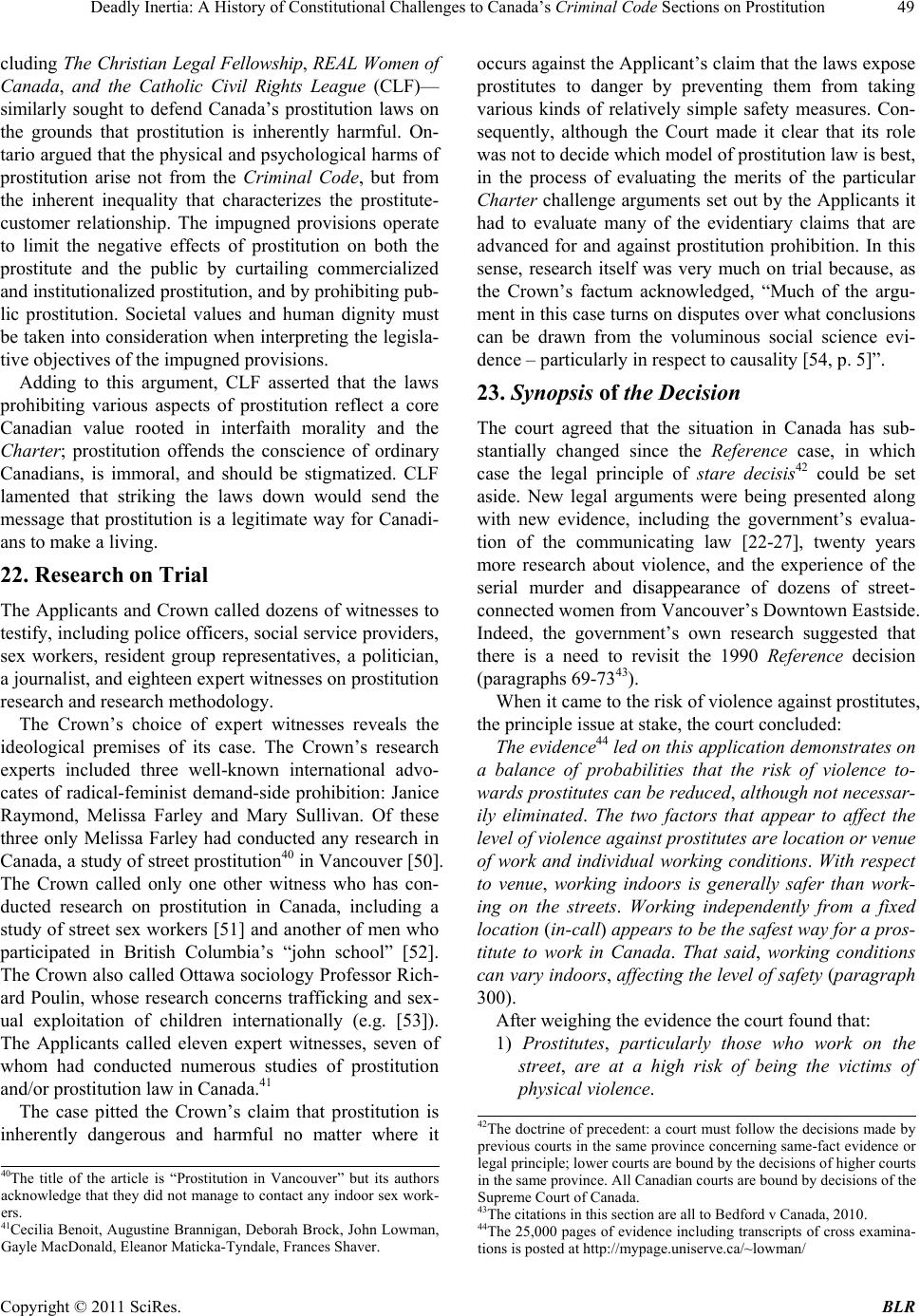 Deadly Inertia: A History of Constitutional Challenges to Canada’s Criminal Code Sections on Prostitution49 cluding The Christian Legal Fellowship, REAL Women of Canada, and the Catholic Civil Rights League (CLF)— similarly sought to defend Canada’s prostitution laws on the grounds that prostitution is inherently harmful. On- tario argued that the physical and psychological harms of prostitution arise not from the Criminal Code, but from the inherent inequality that characterizes the prostitute- customer relationship. The impugned provisions operate to limit the negative effects of prostitution on both the prostitute and the public by curtailing commercialized and institutionalized p rostitution , and by proh ibiting pub- lic prostitution. Societal values and human dignity must be taken into con sideration when interpreting the legisla- tive objectives of the impugned provisions. Adding to this argument, CLF asserted that the laws prohibiting various aspects of prostitution reflect a core Canadian value rooted in interfaith morality and the Charter; prostitution offends the conscience of ordinary Canadians, is immoral, and should be stigmatized. CLF lamented that striking the laws down would send the message that prostitution is a legitimate way for Canadi- ans to make a living. 22. Research on Trial The Applicants and Crown called dozens of witnesses to testify, including police officers, social service providers, sex workers, resident group representatives, a politician, a journalist, and eighteen expert witnesses on prostitu tion research and research methodology. The Crown’s choice of expert witnesses reveals the ideological premises of its case. The Crown’s research experts included three well-known international advo- cates of radical-feminist demand-side prohibition: Janice Raymond, Melissa Farley and Mary Sullivan. Of these three only Melissa Farley had conducted any research in Canada, a study of street prostitution40 in Vancouver [50]. The Crown called only one other witness who has con- ducted research on prostitution in Canada, including a study of street sex workers [51] and another of men who participated in British Columbia’s “john school” [52]. The Crown also called Ottawa sociology Professor Rich- ard Poulin, whose research concerns trafficking and sex- ual exploitation of children internationally (e.g. [53]). The Applicants called eleven expert witnesses, seven of whom had conducted numerous studies of prostitution and/or prostitution law in Canada.41 The case pitted the Crown’s claim that prostitution is inherently dangerous and harmful no matter where it occurs against the Applicant’s claim that the laws expose prostitutes to danger by preventing them from taking various kinds of relatively simple safety measures. Con- sequently, although the Court made it clear that its role was not to decide which model of pros titution law is best, in the process of evaluating the merits of the particular Charter challenge arguments set out by the Applicants it had to evaluate many of the evidentiary claims that are advanced for and against prostitution prohibition. In this sense, research itself was very much on trial because, as the Crown’s factum acknowledged, “Much of the argu- ment in this case turns on disputes over what conclusions can be drawn from the voluminous social science evi- dence – particularly in respect to cau s ality [54, p. 5]”. 23. Synopsis of the Decision The court agreed that the situation in Canada has sub- stantially changed since the Reference case, in which case the legal principle of stare decisis42 could be set aside. New legal arguments were being presented along with new evidence, including the government’s evalua- tion of the communicating law [22-27], twenty years more research about violence, and the experience of the serial murder and disappearance of dozens of street- connected women from Vancouver’s Downtown Eastside. Indeed, the government’s own research suggested that there is a need to revisit the 1990 Reference decision (paragraphs 69-7343). When it came to the risk of violence against prostitutes, the principle issue at stake, the court concluded: The evidence44 led on this application demonstrates on a balance of probabilities that the risk of violence to- wards prostitu tes can be reduced, although no t necessar- ily eliminated. The two factors that appear to affect the level of violence against prostitutes are location or venue of work and individual working conditions. With respect to venue, working indoors is generally safer than work- ing on the streets. Working independently from a fixed location (in-ca ll) appears to be the safest way for a pros- titute to work in Canada. That said, working conditions can vary indoors, affecting the level of safety (paragraph 300). After weighing the evidence the co urt found that: 1) Prostitutes, particularly those who work on the street, are at a high risk of being the victims of physical violence. 42The doctrine of precedent: a court must follow the decisions made by revious courts in the same province concerning same-fact evidence or legal principle; lower courts are bound by the decisions of higher courts in the same province. All Canadian courts are bound by decisions of the Supreme Court of Canada. 43The citations in this section are all to Bedford v Canada, 2010. 44The 25,000 pages of evidence including transcripts of cross examina- tions is posted at http://mypage.uniserve.ca/~lowman/ 40The title of the article is “Prostitution in Vancouver” but its authors acknowledge that they did not manage to contact any indoor sex work- ers. 41Cecilia Benoit, Augustine Brannigan, Deborah Brock, John Lowman, Gayle MacDonald, Eleanor Maticka-Tyndale, Frances Shaver. Copyright © 2011 SciRes. BLR
