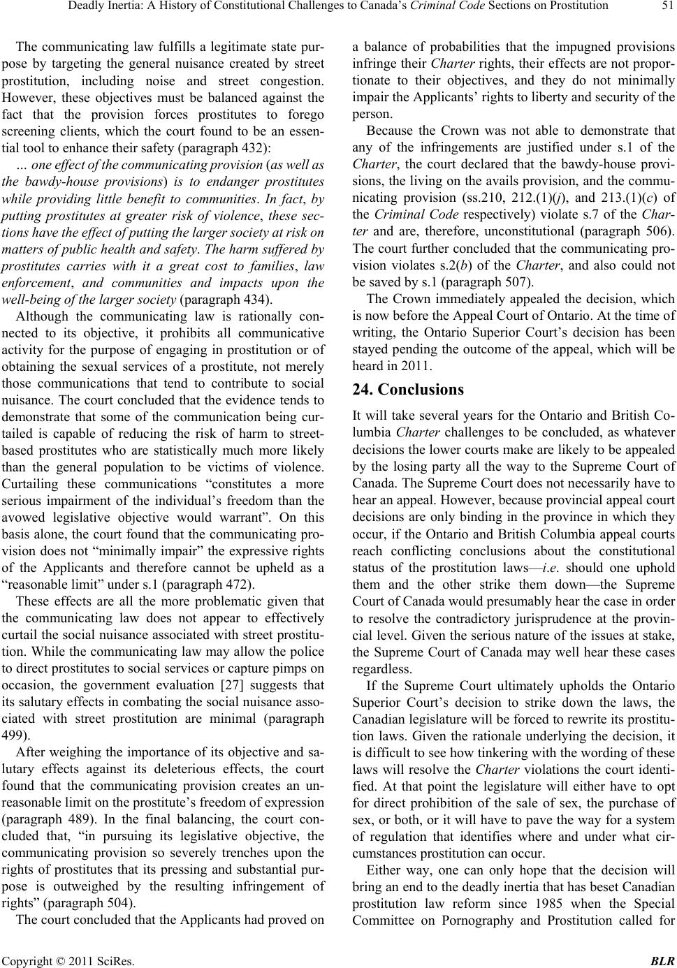Deadly Inertia: A History of Constitutional Challenges to Canada’s Criminal Code Sections on Prostitution51 The communicating law fulfills a legitimate state pur- pose by targeting the general nuisance created by street prostitution, including noise and street congestion. However, these objectives must be balanced against the fact that the provision forces prostitutes to forego screening clients, which the court found to be an essen- tial tool to enhance their safety (paragraph 432): … one effect of the communicat ing provision (as well as the bawdy-house provisions) is to endanger prostitutes while providing little benefit to communities. In fact, by putting prostitutes at greater risk of violence, these sec- tions have the effect of putting the larger society at risk on matters of public health and safety. Th e harm suffere d by prostitutes carries with it a great cost to families, law enfor cement, and communities and impacts upon the well-being of the larger society (paragraph 434). Although the communicating law is rationally con- nected to its objective, it prohibits all communicative activity for the purpose of engaging in prostitution or of obtaining the sexual services of a prostitute, not merely those communications that tend to contribute to social nuisance. The court concluded that the evidence tends to demonstrate that some of the communication being cur- tailed is capable of reducing the risk of harm to street- based prostitutes who are statistically much more likely than the general population to be victims of violence. Curtailing these communications “constitutes a more serious impairment of the individual’s freedom than the avowed legislative objective would warrant”. On this basis alone, the court found that the communicating pro- vision does not “minimally impair” the expressive rights of the Applicants and therefore cannot be upheld as a “reasonable limit” under s.1 (paragraph 472). These effects are all the more problematic given that the communicating law does not appear to effectively curtail the social nuisance asso ciated with street prostitu- tion. While the communicatin g law may allow the police to direct prostitutes to social services or cap ture pimps on occasion, the government evaluation [27] suggests that its salutary effects in combating the social nuisance asso- ciated with street prostitution are minimal (paragraph 499). After weighing the importance of its objective and sa- lutary effects against its deleterious effects, the court found that the communicating provision creates an un- reasonable limit on the prostitu te’s freedom of expression (paragraph 489). In the final balancing, the court con- cluded that, “in pursuing its legislative objective, the communicating provision so severely trenches upon the rights of prostitutes that its pressing and substantial pur- pose is outweighed by the resulting infringement of rights” (paragraph 504). The court concluded that the Applicants had proved on a balance of probabilities that the impugned provisions infringe their Charter rights, their effects are not propor- tionate to their objectives, and they do not minimally impair the Applicants’ rights to liberty and secu rity of the person. Because the Crown was not able to demonstrate that any of the infringements are justified under s.1 of the Charter, the court declared that the bawdy-house provi- sions, the living on the avails provision, and the commu- nicating provision (ss.210, 212.(1)(j), and 213.(1)(c) of the Criminal Code respectively) violate s.7 of the Char- ter and are, therefore, unconstitutional (paragraph 506). The court further concluded that the communicating pro- vision violates s.2(b) of the Charter, and also could not be saved by s.1 (paragraph 507). The Crown immediately appealed the decision, which is now before the Appeal Court of Ontario. At the time of writing, the Ontario Superior Court’s decision has been stayed pending the outcome of the appeal, which will be heard in 2011. 24. Conclusions It will take several years for the Ontario and British Co- lumbia Charter challenges to be concluded, as whatever decisions the lower courts make are likely to be appealed by the losing party all the way to the Supreme Court of Canada. The Supreme Court does not necessarily have to hear an appeal. However, because provincial appeal court decisions are only binding in the province in which they occur, if the Ontario and British Columbia appeal courts reach conflicting conclusions about the constitutional status of the prostitution laws—i.e. should one uphold them and the other strike them down—the Supreme Court of Canada would presumably hear the case in order to resolve the contradictory jurisprudence at the provin- cial level. Given the serious nature of the issu es at stake, the Supreme Court of Canada may well hear these cases regardless. If the Supreme Court ultimately upholds the Ontario Superior Court’s decision to strike down the laws, the Canadian legislatu re will be forced to rewrite its prostitu- tion laws. Given the rationale underlying the decision, it is difficult to see how tinkering with the wording of these laws will resolve the Charter violations the court identi- fied. At that point the legislature will either have to opt for direct prohibition of the sale of sex, the purchase of sex, or both, or it will have to pave the way for a system of regulation that identifies where and under what cir- cumstances prostitution can occur. Either way, one can only hope that the decision will bring an end to the dead ly inertia that has beset Canadian prostitution law reform since 1985 when the Special Committee on Pornography and Prostitution called for Copyright © 2011 SciRes. BLR