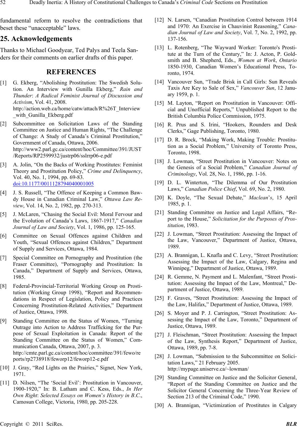 Deadly Inertia: A History of Constitutional Challenges to Canada’s Criminal Code Sections on Prostitution 52 fundamental reform to resolve the contradictions that beset these “unacceptable” laws. 25. Acknowledgements Thanks to Michael Goodyear, Ted Palys and Teela San- ders for their commen ts on earlier drafts of this paper. REFERENCES [1] G. Ekberg, “Abolishing Prostitution: The Swedish Solu- tion. An Interview with Gunilla Ekberg,” Rain and Thunder: A Radical Feminist Journal of Discussion and Activism, Vol. 41, 2008. http://action.web.ca/home/catw/attach/R%26T_Interview _with_Gunilla_Ekberg.pdf [2] Subcommittee on Solicitation Laws of the Standing Committee on Justice and Human Rights, “The Challenge of Change: A Study of Canada’s Criminal Prostitution,” Government of Canada, Ottawa, 2006. http://www2.parl.gc.ca/content/hoc/Committee/391/JUST /Reports/RP2599932/justrp06/sslrrp06-e.pdf [3] A. Jolin, “On the Backs of Working Prostitutes: Feminist Theory and Prostitution Policy,” Crime and Delinquency, Vol. 40, No. 1, 1994, pp. 69-83. doi:10.1177/0011128794040001005 [4] J. S. Russell, “The Offence of Keeping a Common Baw- dy House in Canadian Criminal Law,” Ottawa Law Re- view, Vol. 14, No. 2, 1982, pp. 270-313. [5] J. McLaren, “Chasing the Soc ial Evil: Moral Fervour and the Evolution of Canada’s Laws, 1867-1917,” Canadian Journal of Law and Society, Vol. 1, 1986, pp. 125-165. [6] Committee on Sexual Offences against Children and Youth, “Sexual Offences against Children,” Department of Supply and Services, Ottawa, 1984. [7] Special Committee on Pornography and Prostitution (the Fraser Committee), “Pornography and Prostitution: In Canada,” Department of Supply and Services, Ottawa, 1985. [8] Federal-Provincial-Territorial Working Group on Prosti- tution (Working Group 1998), “Report and Recommen- dations in Respect of Legislation, Policy and Practices Concerning Prostitution-Related Activities,” Department of Justice, Ottawa, 1998. [9] Standing Committee on the Status of Women, “Turning Outrage into Action to Address Trafficking for the Pur- pose of Sexual Exploitation in Canada: Report of the Standing Committee on the Status of Women,” Com- munication Canada, Ottawa, 2007, p. 3. http://cmte.parl.gc.ca/content/hoc/committee/391/fewo/re ports/rp2738918/feworp12/feworp12-e.pdf [10] J. Gray, “Red Lights on the Prairies,” Signet, New York, 1971. [11] D. Nilsen, “The ‘Social Evil’: Prostitution in Vancouver, 1900-1920,” In: B. Latham and C. Kess, Eds., In Her Own Right: Selected Essays on Women’s History in B.C., Camosun College, Victoria, 1980, pp. 205-228. [12] N. Larsen, “Canadian Prostitution Control between 1914 and 1970: An Exercise in Chauvinist Reasoning,” Cana- dian Journal of Law and Society, Vol. 7, No. 2, 1992, pp. 137-156. [13] L. Rotenberg, “The Wayward Worker: Toronto's Prosti- tute at the Turn of the Century,” In: J. Acton, P. Gold- smith and B. Shepherd, Eds., Women at Work, Ontario 1850-1930, Canadian Women’s Educational Press, To- ronto, 1974. [14] Vancouver Sun, “Trade Brisk in Call Girls: Sun Reveals Taxis Are Key to Sale of Sex,” Vancouver Sun, 12 Janu- ary 1959, p. 1. [15] M. Layton, “Report on Prostitution in Vancouver: Offi- cial and Unofficial Reports,” Unpublished Report to the British Columbia Police Commission, 1975. [16] R. Prus and S. Irini, “Hookers, Rounders and Desk Clerks,” Gage Publishing, Toronto, 1980. [17] D. R. Brock, “Making Work, Making Trouble: Prostitu- tion as a Social Problem,” University of Toronto Press, Toronto, 1998. [18] J. Lowman, “Street Prostitution in Vancouver: Notes on the Genesis of a Social Problem,” Canadian Journal of Criminology, Vol. 28, No. 1, 1986, pp. 1-16. [19] D. L. Winterton, “The Dilemma of Our Prostitution Laws,” Canadian Police Chief, Vol. 69, No. 2, 1980. [20] K. Doyle, “The Sexual Debate,” Maclean’s, 15 April 1985, p. 1. [21] Standing Committee on Justice and Legal Affairs, “Re- port to the House,” Solicitation for the Purposes of Pros- titution, 1983. [22] J. Lowman, “Street Prostitution: Assessing the Impact of the Law, Vancouver,” Department of Justice, Ottawa, 1989. [23] A. Brannigan, L. Knafla and C. Levy, “Street Prostitution: Assessing the Impact of the Law, Calgary, Regina and Winnipeg,” Department of Justice, Ottawa, 1989. [24] R. Gemme, N. Payment and L. Malenfant, “Street Prosti- tution: Assessing the Impact of the Law, Montreal,” De- partment of Justice, Ottawa, 1989. [25] F. Graves, “Street Prostitution: Assessing the Impact of the Law, Halifax,” Department of Justice, Ottawa, 1989. [26] S. Moyer and P. J. Carrington, “Street Prostitution: As- sessing the Impact of the Law, Toronto,” Department of Justice, Ottawa, 1989. [27] J. Fleischman, “Street Prostitution: Assessing the Impact of the Law, Synthesis Report,” Department of Justice, Ottawa, 1989, pp. 7-8. [28] J. Lowman, “Submission to the Subcommittee on Solici- tation Laws,” 21 February 2005. http://mypage.uniserve.ca/~lowman/ [29] Standing Committee on Justice and the Solicitor General, “Report of the Standing Committee on Justice and the Solicitor General Concerning the Three-Year Review of Section 213 of the Criminal Code,” 1990. [30] A. Brannigan, “Victimization of Prostitutes in Calgary Copyright © 2011 SciRes. BLR