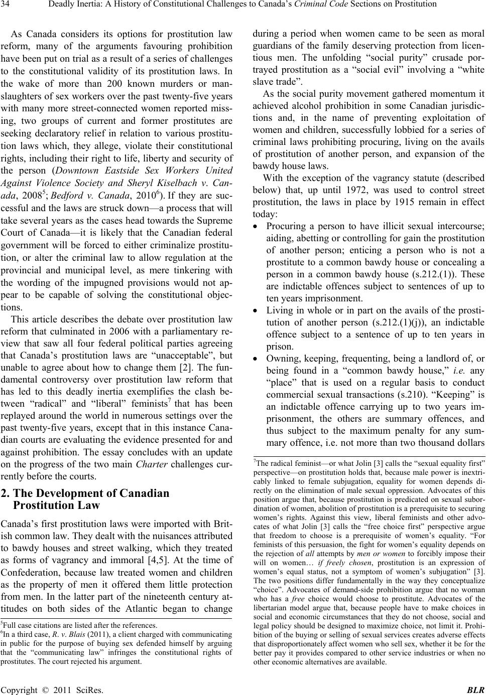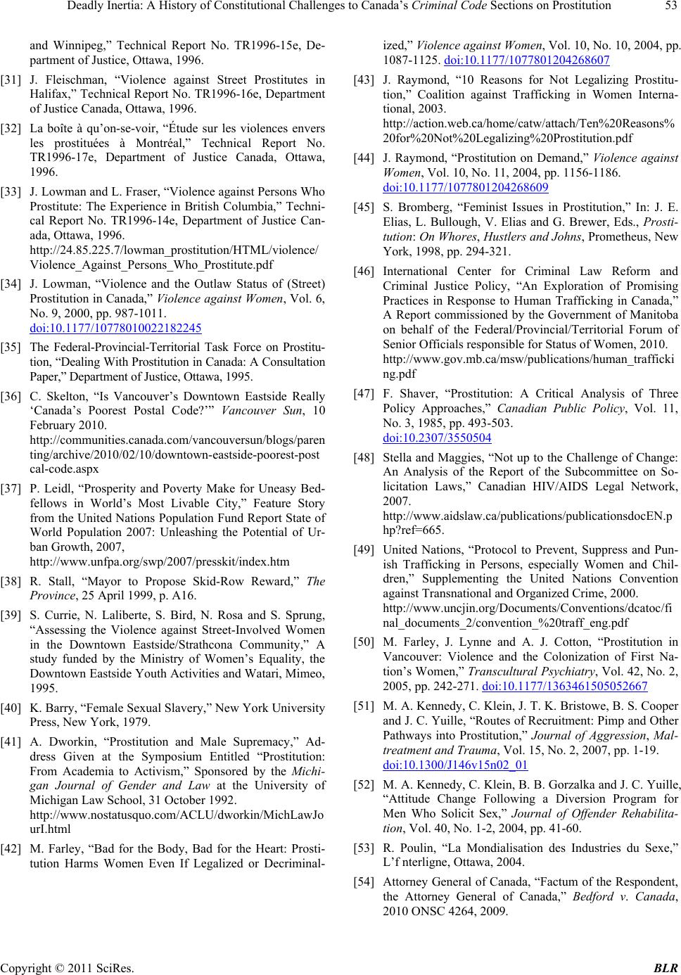 Deadly Inertia: A History of Constitutional Challenges to Canada’s Criminal Code Sections on Prostitution53 and Winnipeg,” Technical Report No. TR1996-15e, De- partment of Justice, Ottawa, 1996. [31] J. Fleischman, “Violence against Street Prostitutes in Halifax,” Technical Report No. TR1996-16e, Department of Justice Canada, Ottawa, 1996. [32] La boîte à qu’on-se-voir, “Étude sur les violences envers les prostituées à Montréal,” Technical Report No. TR1996-17e, Department of Justice Canada, Ottawa, 1996. [33] J. Lowman and L. Fraser, “Violence against Persons Who Prostitute: The Experience in British Columbia,” Techni- cal Report No. TR1996-14e, Department of Justice Can- ada, Ottawa, 1996. http://24.85.225.7/lowman_prostitution/HTML/violence/ Violence_Against_Persons_Who_Prostitute.pdf [34] J. Lowman, “Violence and the Outlaw Status of (Street) Prostitution in Canada,” Violence against Women, Vol. 6, No. 9, 2000, pp. 987-1011. doi:10.1177/10778010022182245 [35] The Federal-Provincial-Territorial Task Force on Prostitu- tion, “Dealing With Prostitution in Canada: A Consultation Paper,” Department of Justice, Ottawa, 1995. [36] C. Skelton, “Is Vancouver’s Downtown Eastside Really ‘Canada’s Poorest Postal Code?’” Vancouver Sun, 10 February 2010. http://communities.canada.com/vancouversun/blogs/paren ting/archive/2010/02/10/downtown-eastside-poorest-post cal-code.aspx [37] P. Leidl, “Prosperity and Poverty Make for Uneasy Bed- fellows in World’s Most Livable City,” Feature Story from the United Nations Population Fund Report State of World Population 2007: Unleashing the Potential of Ur- ban Growth, 2007, http://www.unfpa.org/swp/2007/presskit/index.htm [38] R. Stall, “Mayor to Propose Skid-Row Reward,” The Province, 25 April 1999, p. A16. [39] S. Currie, N. Laliberte, S. Bird, N. Rosa and S. Sprung, “Assessing the Violence against Street-Involved Women in the Downtown Eastside/Strathcona Community,” A study funded by the Ministry of Women’s Equality, the Downtown Eastside Youth Activities and Watari, Mimeo, 1995. [40] K. Barry, “Female Sexual Slavery,” New York University Press, New York, 1979. [41] A. Dworkin, “Prostitution and Male Supremacy,” Ad- dress Given at the Symposium Entitled “Prostitution: From Academia to Activism,” Sponsored by the Mich i- gan Journal of Gender and Law at the University of Michigan Law School, 31 October 1992. http://www.nostatusquo.com/ACLU/dworkin/MichLawJo urI.html [42] M. Farley, “Bad for the Body, Bad for the Heart: Prosti- tution Harms Women Even If Legalized or Decriminal- ized,” Violence against Women, Vol. 10, No. 10, 2004, pp. 1087-1125. doi:10.1177/1077801204268607 [43] J. Raymond, “10 Reasons for Not Legalizing Prostitu- tion,” Coalition against Trafficking in Women Interna- tional, 2003. http://action.web.ca/home/catw/attach/Ten%20Reasons% 20for%20Not%20Legalizing%20Prostitution.pdf [44] J. Raymond, “Prostitution on Demand,” Violence against Women, Vol. 10, No. 11, 2004, pp. 1156-1186. doi:10.1177/1077801204268609 [45] S. Bromberg, “Feminist Issues in Prostitution,” In: J. E. Elias, L. Bullough, V. Elias and G. Brewer, Eds., Prosti- tution: On Whores, Hustlers and Johns, Prometheus, New York, 1998, pp. 294-321. [46] International Center for Criminal Law Reform and Criminal Justice Policy, “An Exploration of Promising Practices in Response to Human Trafficking in Canada,” A Report commissioned by the Government of Manitoba on behalf of the Federal/Provincial/Territorial Forum of Senior Officials responsible for Status of Women, 2010. http://www.gov.mb.ca/msw/publications/human_trafficki ng.pdf [47] F. Shaver, “Prostitution: A Critical Analysis of Three Policy Approaches,” Canadian Public Policy, Vol. 11, No. 3, 1985, pp. 493-503. doi:10.2307/3550504 [48] Stella and Maggies, “Not up to the Challenge of Change: An Analysis of the Report of the Subcommittee on So- licitation Laws,” Canadian HIV/AIDS Legal Network, 2007. http://www.aidslaw.ca/publications/publicationsdocEN.p hp?ref=665. [49] United Nations, “Protocol to Prevent, Suppress and Pun- ish Trafficking in Persons, especially Women and Chil- dren,” Supplementing the United Nations Convention against Transnational and Organized Crime, 2000. http://www.uncjin.org/Documents/Conventions/dcatoc/fi nal_documents_2/convention_%20traff_eng.pdf [50] M. Farley, J. Lynne and A. J. Cotton, “Prostitution in Vancouver: Violence and the Colonization of First Na- tion’s Women,” Transcultural Psychiatry, Vol. 42, No. 2, 2005, pp. 242-271. doi:10.1177/1363461505052667 [51] M. A. Kennedy, C. Klein, J. T. K. Bristowe, B. S. Cooper and J. C. Yuille, “Routes of Recruitment: Pimp and Other Pathways into Prostitution,” Journal of Aggression, Mal- treatment and Trauma, Vol. 15, No. 2, 2007, pp. 1-19. doi:10.1300/J146v15n02_01 [52] M. A. Kennedy, C. Klein, B. B. Gorzalka and J. C. Yuille, “Attitude Change Following a Diversion Program for Men Who Solicit Sex,” Journal of Offender Rehabilita- tion, Vol. 40, No. 1-2, 2004, pp. 41-60. [53] R. Poulin, “La Mondialisation des Industries du Sexe,” L’f nterligne, Ottawa, 2004. [54] Attorney General of Canada, “Factum of the Respondent, the Attorney General of Canada,” Bedford v. Canada, 2010 ONSC 4264, 2009. Copyright © 2011 SciRes. BLR