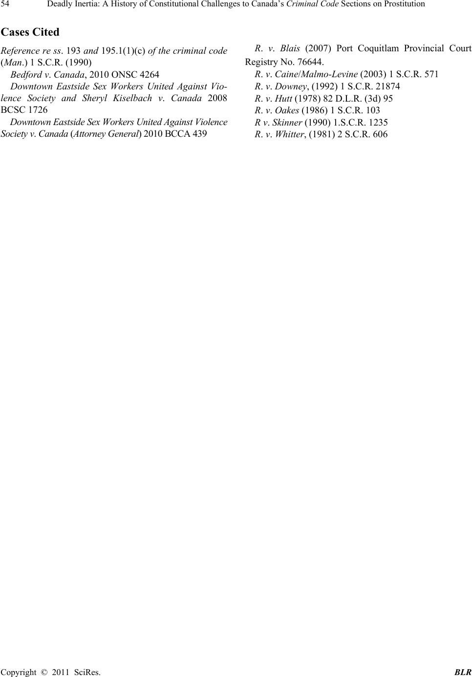 Deadly Inertia: A History of Constitutional Challenges to Canada’s Criminal Code Sections on Prostitution Copyright © 2011 SciRes. BLR 54 Cases Cited Reference re ss. 193 and 195.1(1)(c) of the criminal code (Man.) 1 S.C.R. (1990) Bedford v. Canada, 2010 ONSC 4264 Downtown Eastside Sex Workers United Against Vio- lence Society and Sheryl Kiselbach v. Canada 2008 BCSC 1726 Downtown Eastside Sex Workers United Against Violence Society v. Canada (Attorney General) 2010 BCCA 439 R. v. Blais (2007) Port Coquitlam Provincial Court Registry No. 76644. R. v. Caine/Malmo-Levine (2003) 1 S.C.R. 571 R. v. Downey, (1992) 1 S.C.R. 21874 R. v. Hutt (1978) 82 D.L.R. (3d) 95 R. v. Oakes (1986) 1 S.C.R. 103 R v. Skinner (1990) 1.S.C.R. 1235 R. v. Whitter, (1981) 2 S.C.R. 606