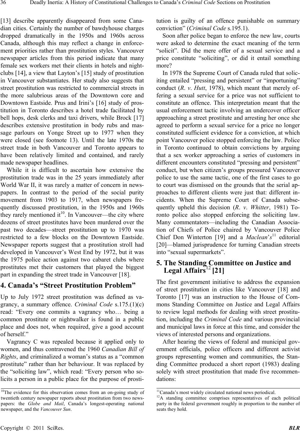 Deadly Inertia: A History of Constitutional Challenges to Canada’s Criminal Code Sections on Prostitution 36 [13] describe apparently disappeared from some Cana- dian cities. Certainly the number of bawdyhouse charges dropped dramatically in the 1950s and 1960s across Canada, although this may reflect a change in enforce- ment priorities rather than prostitution styles. Vancouver newspaper articles from this period indicate that many female sex workers met their clients in hotels and night- clubs [14], a view that Layton’s [15] study of prostitution in Vancouver substantiates. Her study also suggests that street prostitution was restricted to commercial streets in the more salubrious areas of the Downtown core and Downtown Eastside. Prus and Irini’s [16] study of pros- titution in Toronto describes a hotel trade facilitated by bell hops, desk clerks and taxi drivers, while Brock [17] describes extensive prostitution in body rubs and mas- sage parlours on Yonge Street up to 1977 when they were closed (see footnote 13). Until the late 1970s the street trade in both Vancouver and Toronto appears to have been relatively limited and contained, and rarely made newspaper headlines. While it is difficult to ascertain how extensive the prostitution trade was in the 25 years immediately after World War II, it was rarely a matter of concern in news- papers. In contrast to the period of the social purity movement from 1903 to 1917, when newspapers fre- quently discussed prostitution, in the 1950s and 1960s they rarely mentioned it10. In Vancouver—the city where dozens of street prostitutes have been murdered over the past two decades—street prostitution up to 1970 was restricted to a few blocks on the Downtown Eastside. Newspaper reports suggest that a prostitution stroll had developed in Vancouver’s West End by 1972, but it was the 1975 police action against two cabaret clubs where prostitutes met their customers that played the biggest part in expanding the street trade in Vancouver [18]. 4. Canada’s “Street Prostitution Problem” Up to July 1972 street prostitution was defined as va- grancy, a summary offence. Criminal Code s.175.(1)(c) read: “Every one commits a vagrancy who… being a common prostitute or nightwalker is found in a public place and does not, when required, give a good account of herself.” Vagrancy C was repealed because it applied only to women, and thus contravened the 1960 Canadian Bill of Rights, and criminalized a woman’s status as a “common prostitute” rather than her behaviour. It was replaced by the “soliciting law”, which read: “Every person who so- licits a person in a public place for the purpose of prosti- tution is guilty of an offence punishable on summary conviction” (Criminal Code s.195.1). Soon after police began to enforce the new law, courts were asked to determine the exact meaning of the term “solicit”. Did the mere offer of a sexual service and a price constitute “soliciting”, or did it entail something more? In 1978 the Supreme Cour t of Canada ruled that solic- iting entailed “pressing and persistent” or “importuning” conduct (R. v. Hutt, 1978), which meant that merely of- fering a sexual service for a price was not sufficient to constitute an offence. This interpretation meant that the usual enforcement tactic involving an undercover officer approaching a street prostitute and arresting her once she agreed to perform a sexual service for a price no longer constituted sufficient evidence for a conviction, at which point Vancouver police sto pped enfor cing the law. Police in Toronto continued to obtain convictions by arguing that a sex worker approaching a series of customers in different encounters con stituted “pressing and persistent” conduct, but when citizen’s groups pressured Vancouver police to use the same tactic, one of the first cases to go to court was dismissed on the grounds that the serial ap- proaches to different clients were just that: different in- cidents. When the Supreme Court of Canada subse- quently upheld this decision (R. v. Whitter, 1981) To- ronto police also stopped enforcing the soliciting law. Many commentators—including the Canadian Associa- tion of Chiefs of Police chaired by Vancouver Police Chief Don Winterton [19] and a Maclean’s11 editorial [20]—blamed jurisprudence for turning Canadian streets into “sexual supermarkets”. 5. The Standing Committee on Justice and Legal Affairs12 [21] The first government initiative to address the expansion of street prostitution in cities like Vancouver [18] and Toronto [17] was an instruction to the House of Com- mons Standing Committee on Justice and Legal Affairs to review legal methods for dealing with street prostitu- tion, including the Criminal Code and various provincial and municipal laws in force at this time, and cons ider the views of interested persons and organizations. After hearing the views of federal and municipal gov- ernment officials, police officers and different activist groups representing women and communities, the Stan- ding Committee produced a short report (1983) dealing solely with street prostitution that made five recommen- dations: 11Canada’s most widely circulated national news periodical. 12A standing committee comprises representatives of each political arty in he federal government roughly in proportion to the number o seats they hold. 10The evidence for this observation comes from an on-going study o twentieth century newspaper reports about prostitution from two news- apers: the Globe and Mail, Canada’s longest-operating national newspaper, and the Vancouver Sun. Copyright © 2011 SciRes. BLR