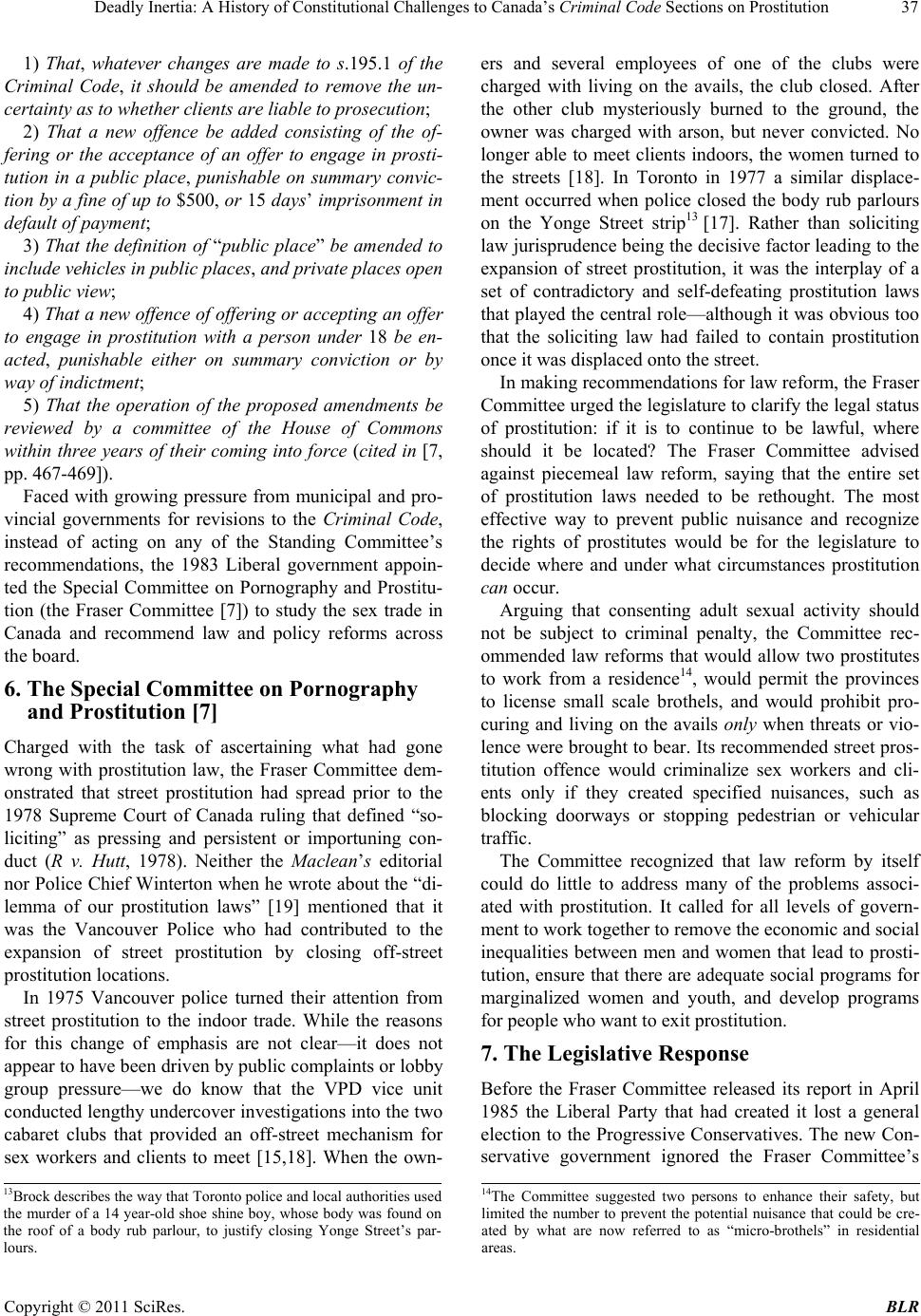 Deadly Inertia: A History of Constitutional Challenges to Canada’s Criminal Code Sections on Prostitution37 1) That, whatever changes are made to s.195.1 of the Criminal Code, it should be amended to remove the un- certainty as to whether clients are liable to prosecution; 2) That a new offence be added consisting of the of- fering or the acceptance of an offer to engage in prosti- tution in a public place, punishable on summary convic- tion by a fine of up to $500, or 15 days’ imprisonment in default of payment; 3) That the definition of “public place” be amended to include vehicles in public places, and private places open to public view; 4) That a new offence of offering or accepting an offer to engage in prostitution with a person under 18 be en- acted, punishable either on summary conviction or by way of indictme nt ; 5) That the operation of the proposed amendments be reviewed by a committee of the House of Commons within three years of their coming into force (cited in [7, pp. 467-469]). Faced with growing pressure from municipal and pro- vincial governments for revisions to the Criminal Code, instead of acting on any of the Standing Committee’s recommendations, the 1983 Liberal government appoin- ted the Special Committee on Pornography and Prostitu- tion (the Fraser Committee [7]) to study the sex trade in Canada and recommend law and policy reforms across the board. 6. The Special Committee on Pornography and Prostitution [7] Charged with the task of ascertaining what had gone wrong with prostitution law, the Fraser Committee dem- onstrated that street prostitution had spread prior to the 1978 Supreme Court of Canada ruling that defined “so- liciting” as pressing and persistent or importuning con- duct (R v. Hutt, 1978). Neither the Maclean’s editorial nor Police Chief Winterton when he wrote about the “di- lemma of our prostitution laws” [19] mentioned that it was the Vancouver Police who had contributed to the expansion of street prostitution by closing off-street prostitution lo cations. In 1975 Vancouver police turned their attention from street prostitution to the indoor trade. While the reasons for this change of emphasis are not clear—it does not appear to have been driven by public complaints or lobby group pressure—we do know that the VPD vice unit conducted lengthy u ndercover investigation s into the two cabaret clubs that provided an off-street mechanism for sex workers and clients to meet [15,18]. When the own- ers and several employees of one of the clubs were charged with living on the avails, the club closed. After the other club mysteriously burned to the ground, the owner was charged with arson, but never convicted. No longer able to meet clients indoors, the women turned to the streets [18]. In Toronto in 1977 a similar displace- ment occurred when police closed the body rub parlours on the Yonge Street strip13 [17]. Rather than soliciting law jurisprudence being the decisive factor leading to the expansion of street prostitution, it was the interplay of a set of contradictory and self-defeating prostitution laws that played the central role—altho ugh it was obvious too that the soliciting law had failed to contain prostitution once it was displaced onto the street. In making recommendations for law reform, the Fraser Committee urged the legislature to clarify the legal status of prostitution: if it is to continue to be lawful, where should it be located? The Fraser Committee advised against piecemeal law reform, saying that the entire set of prostitution laws needed to be rethought. The most effective way to prevent public nuisance and recognize the rights of prostitutes would be for the legislature to decide where and under what circumstances prostitution can occur. Arguing that consenting adult sexual activity should not be subject to criminal penalty, the Committee rec- ommended law reforms that would allow two prostitutes to work from a residence14, would permit the provinces to license small scale brothels, and would prohibit pro- curing and living on the avails only when threats or vio- lence were brought to bear. Its recommended street pros- titution offence would criminalize sex workers and cli- ents only if they created specified nuisances, such as blocking doorways or stopping pedestrian or vehicular traffic. The Committee recognized that law reform by itself could do little to address many of the problems associ- ated with prostitution. It called for all levels of govern- ment to work tog ether to r emo ve the economic an d social inequalities between men and women that lead to prosti- tution, ensure that there are adequate social programs for marginalized women and youth, and develop programs for people who want to exit prostitution. 7. The Legislative Response Before the Fraser Committee released its report in April 1985 the Liberal Party that had created it lost a general election to the Progressive Conservatives. The new Con- servative government ignored the Fraser Committee’s 13Brock describes the way that Toronto police and local authorities used the murder of a 14 year-old shoe shine boy, whose body was found on the roof of a body rub parlour, to justify closing Yonge Street’s par- lours. 14The Committee suggested two persons to enhance their safety, but limited the number to prevent the potential nuisance that could be cre- ated by what are now referred to as “micro- rothels” in residential areas. Copyright © 2011 SciRes. BLR