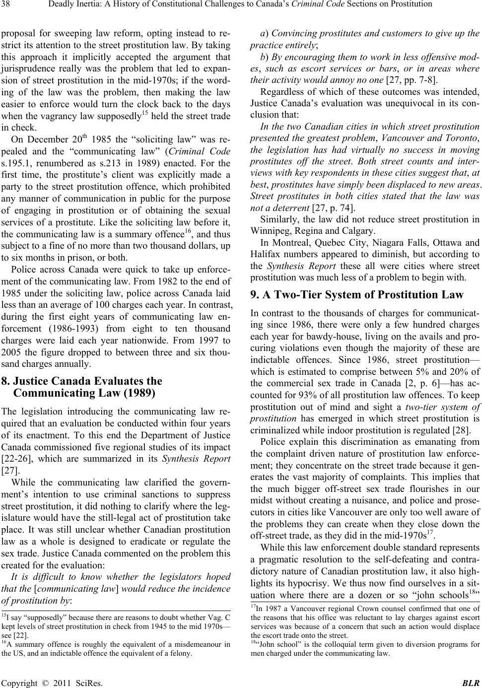 Deadly Inertia: A History of Constitutional Challenges to Canada’s Criminal Code Sections on Prostitution 38 proposal for sweeping law reform, opting instead to re- strict its attention to the street prostitution law. By taking this approach it implicitly accepted the argument that jurisprudence really was the problem that led to expan- sion of street prostitution in the mid-1970s; if the word- ing of the law was the problem, then making the law easier to enforce would turn the clock back to the days when the vagrancy law supposedly15 held the street trade in check. On December 20th 1985 the “soliciting law” was re- pealed and the “communicating law” (Criminal Code s.195.1, renumbered as s.213 in 1989) enacted. For the first time, the prostitute’s client was explicitly made a party to the street prostitution offence, which prohibited any manner of communication in public for the purpose of engaging in prostitution or of obtaining the sexual services of a prostitute. Like the soliciting law before it, the communicating law is a summary offence16, and thus subject to a fine of no more than two thousand dollar s, up to six months in prison, or both. Police across Canada were quick to take up enforce- ment of the communicating law. From 1982 to the end of 1985 under the soliciting law, police across Canada laid less than an average of 100 charges each year. In contrast, during the first eight years of communicating law en- forcement (1986-1993) from eight to ten thousand charges were laid each year nationwide. From 1997 to 2005 the figure dropped to between three and six thou- sand charges annually. 8. Justice Canada Evaluates the Communicating Law (1989) The legislation introducing the communicating law re- quired that an evaluation be conducted within four years of its enactment. To this end the Department of Justice Canada commissioned five regional studies of its impact [22-26], which are summarized in its Synthesis Report [27]. While the communicating law clarified the govern- ment’s intention to use criminal sanctions to suppress street prostitution, it did nothing to clarify where the leg - islature would have the still-legal act of prostitution take place. It was still unclear whether Canadian prostitution law as a whole is designed to eradicate or regulate the sex trade. Justice Canada commented on the problem this created for the evaluation: It is difficult to know whether the legislators hoped that the [communi catin g law] would reduce the incidence of prostitution by: a) Convincing prostitutes and customers to give up the practice entirely; b) By encouraging them to work in less offensive mod- es, such as escort services or bars, or in areas where their activity woul d annoy no one [27, p p. 7- 8] . Regardless of which of these outcomes was intended, Justice Canada’s evaluation was unequivocal in its con- clusion that: In the two Canadian cities in which street prostitution presented the greatest problem, Vancouver and Toronto, the legislation has had virtually no success in moving prostitutes off the street. Both street counts and inter- views with key respondents in these cities suggest that, at best, prostitutes ha ve simply been d isplaced to n ew areas . Street prostitutes in both cities stated that the law was not a deter rent [27, p. 74]. Similarly, the law did not reduce street prostitution in Winnipeg, Regina and Calgary. In Montreal, Quebec City, Niagara Falls, Ottawa and Halifax numbers appeared to diminish, but according to the Synthesis Report these all were cities where street prostitution was much less of a problem to begin with. 9. A Two-Tier System of Prostitution Law In contrast to the thousands of charges for communicat- ing since 1986, there were only a few hundred charges each year for bawdy-house, living on the avails and pro- curing violations even though the majority of these are indictable offences. Since 1986, street prostitution— which is estimated to comprise between 5% and 20% of the commercial sex trade in Canada [2, p. 6]—has ac- counted for 93% of all prostitution law offen ces. To keep prostitution out of mind and sight a two-tier system of prostitution has emerged in which street prostitution is criminalized while indoo r prostitution is regulated [28]. Police explain this discrimination as emanating from the complaint driven nature of prostitution law enforce- ment; they concentr ate on the street trade because it gen- erates the vast majority of complaints. This implies that the much bigger off-street sex trade flourishes in our midst without creating a nuisance, and police and prose- cutors in cities like Vancouver are only too well aware of the problems they can create when they close down the off-street trade, as they did in the mid-1970s17. While this law enforcement double standard repr esents a pragmatic resolution to the self-defeating and contra- dictory nature of Canadian prostitution law, it also high- lights its hypocrisy. We thus now find ourselves in a sit- uation where there are a dozen or so “john schools18” 17In 1987 a Vancouver regional Crown counsel confirmed that one o the reasons that his office was reluctant to lay charges against escort services was because of a concern that such an action would displace the escort trade onto the street. 18“John school” is the colloquial term given to diversion programs for men charged under the communicating law. 15I say “supposedly” because there are reasons to doubt whether Vag. C kept levels of street prostitution in check from 1945 to the mid 1970s— see [22]. 16A summary offence is roughly the equivalent of a misdemeanour in the US, and an indictable offence the equivalent of a felony. Copyright © 2011 SciRes. BLR