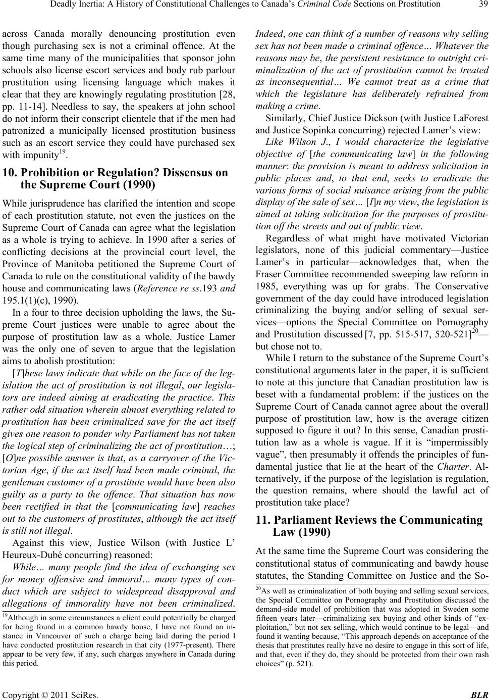 Deadly Inertia: A History of Constitutional Challenges to Canada’s Criminal Code Sections on Prostitution39 across Canada morally denouncing prostitution even though purchasing sex is not a criminal offence. At the same time many of the municipalities that sponsor john schools also license escort services and body rub parlour prostitution using licensing language which makes it clear that they are knowingly regulating prostitution [28, pp. 11-14]. Needless to say, the speakers at john school do not inform their conscript clientele that if the men had patronized a municipally licensed prostitution business such as an escort service they could have purchased sex with impunity19. 10. Prohibition or Regulation? Dissensus on the Supreme Court (1990) While jurisprudence has clarified the inten tion and scope of each prostitution statute, not even the justices on the Supreme Court of Canada can agree what the legislation as a whole is trying to achieve. In 1990 after a series of conflicting decisions at the provincial court level, the Province of Manitoba petitioned the Supreme Court of Canada to rule on the cons titution al v alid ity of the bawdy house and communicating laws (Reference re ss.193 and 195.1(1)(c), 1990). In a four to three decision upholding the laws, the Su- preme Court justices were unable to agree about the purpose of prostitution law as a whole. Justice Lamer was the only one of seven to argue that the legislation aims to abolish prostitution: [T]hese laws indicate that while on th e face of the leg- islation the act of prostitution is not illegal, our legisla- tors are indeed aiming at eradicating the practice. This rather odd situation wherein almost everything related to prostitution has been criminalized save for the act itself gives one reason to ponder why Parliament has not taken the logical step of criminalizing the act of pro stitution…; [O]ne possible answer is that, as a carryover of the Vic- torian Age, if the act itself had been made criminal, the gentleman custom er of a prostitute wou ld have been also guilty as a party to the offence. That situation has now been rectified in that the [communicating law] reaches out to the customers of prostitutes, although the act itself is still not illegal. Against this view, Justice Wilson (with Justice L’ Heureux-Dubé concurring) reasoned: While… many people find the idea of exchanging sex for money offensive and immoral… many types of con- duct which are subject to widespread disapproval and allegations of immorality have not been criminalized. Indeed, one can think of a n umber of reasons why selling sex has not been made a criminal offence… Whatever the reasons may be, the persistent resistance to outright cri- minalization of the act of prostitution cannot be treated as inconsequential… We cannot treat as a crime that which the legislature has deliberately refrained from making a crime. Similarly, Chief Justice Dickson (with Justice LaForest and Justice Sopinka concurring) rejected Lamer’s view: Like Wilson J., I would characterize the legislative objective of [the communicating law] in the following manner: the provision is meant to address solicitation in public places and, to that end, seeks to eradicate the various forms of social nuisance arising from the public display of the sale of sex… [I]n my view, the legislation is aimed at taking solicitation for the purposes of prostitu- tion off the streets and out of pub lic view. Regardless of what might have motivated Victorian legislators, none of this judicial commentary—Justice Lamer’s in particular—acknowledges that, when the Fraser Committee recommended sweeping law reform in 1985, everything was up for grabs. The Conservative government of the day could have introduced legislation criminalizing the buying and/or selling of sexual ser- vices—options the Special Committee on Pornography and Prostitution discussed [7, pp. 515-517, 520-521]20— but chose not to. While I return to the substance of the Supreme Cour t’s constitutional arguments later in the paper, it is sufficient to note at this juncture that Canadian prostitution law is beset with a fundamental problem: if the justices on the Supreme Court of Canada cannot agree about the overall purpose of prostitution law, how is the average citizen supposed to figure it out? In this sense, Canadian prosti- tution law as a whole is vague. If it is “impermissibly vague”, then presumably it offends the principles of fun- damental justice that lie at the heart of the Charter. Al- ternatively, if the purpose of the legislation is regulation, the question remains, where should the lawful act of prostitution take p lace? 11. Parliament Reviews the Communicating Law (1990) At the same time the Supreme Court was consid ering the constitutional status of communicating and bawdy house statutes, the Standing Committee on Justice and the So- 20As well as criminalization of both buying and selling sexual services, the Special Committee on Pornography and Prostitution discussedthe demand-side model of prohibition that was adopted in Sweden some fifteen years later—criminalizing sex buying and other kinds of “ex- loi ation,” but not sex selling, which would continue to be legal—and found it wanting because, “This approach depends on acceptance of the thesis that prostitutes really have no desire to engage in this sort of life, and that, even if they do, they should be protected from their own rash choices” (p. 521). 19Although in some circumstances a client could potentially be charged for being found in a common bawdy house, I have not found an in- stance in Vancouver of such a charge being laid during the period I have conducted prostitution research in that city (1977-present). There appear to be very few, if any, such charges anywhere in Canada during this period. Copyright © 2011 SciRes. BLR