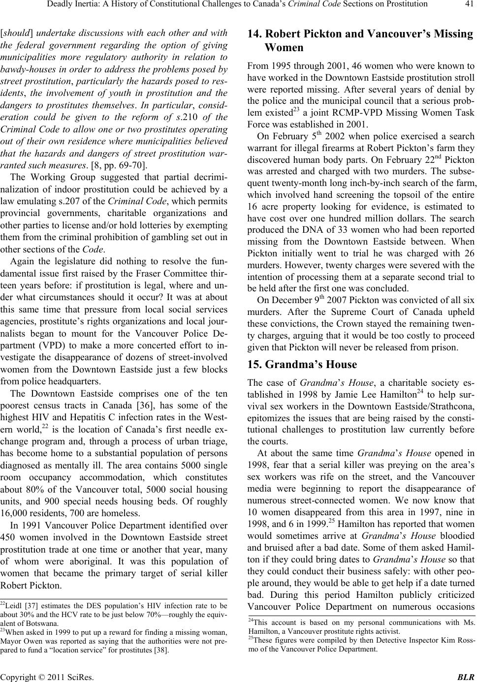 Deadly Inertia: A History of Constitutional Challenges to Canada’s Criminal Code Sections on Prostitution41 [should] undertake discussions with each other and with the federal government regarding the option of giving municipalities more regulatory authority in relation to bawdy-houses in order to address the problems posed by street prostitution, particularly the hazards posed to res- idents, the involvement of youth in prostitution and the dangers to prostitutes themselves. In particular, consid- eration could be given to the reform of s.210 of the Criminal Code to allow one or two prostitutes operating out of their own residence where municipalities believed that the hazards and dangers of street prostitution war- ranted such measures. [8, pp. 69- 70]. The Working Group suggested that partial decrimi- nalization of indoor prostitution could be achieved by a law emulating s.207 of the Criminal Code, which permits provincial governments, charitable organizations and other parties to license and/or hold lotteries by exempting them from the criminal prohibition of gambling set ou t in other sections of the Code. Again the legislature did nothing to resolve the fun- damental issue first raised by the Fraser Committee thir- teen years before: if prostitution is legal, where and un- der what circumstances should it occur? It was at about this same time that pressure from local social services agencies, prostitute’s rights organizations and local jour- nalists began to mount for the Vancouver Police De- partment (VPD) to make a more concerted effort to in- vestigate the disappearance of dozens of street-involved women from the Downtown Eastside just a few blocks from police headquarters. The Downtown Eastside comprises one of the ten poorest census tracts in Canada [36], has some of the highest HIV and Hepatitis C infection rates in the West- ern world,22 is the location of Canada’s first needle ex- change program and, through a process of urban triage, has become home to a substantial population of persons diagnosed as mentally ill. The area contains 5000 single room occupancy accommodation, which constitutes about 80% of the Vancouver total, 5000 social housing units, and 900 special needs housing beds. Of roughly 16,000 residents, 700 are homeless. In 1991 Vancouver Police Department identified over 450 women involved in the Downtown Eastside street prostitution trade at one time or another that year, many of whom were aboriginal. It was this population of women that became the primary target of serial killer Robert Pickton. 14. Robert Pickton and Vancouver’s Missing Women From 1995 through 2001, 46 women who were know n to have worked in the Downtown Eastside prostitution stroll were reported missing. After several years of denial by the police and the municipal council that a serious prob- lem existed23 a joint RCMP-VPD Missing Women Task Force was established in 2001. On February 5th 2002 when police exercised a search warrant for illegal firearms at Robert Pickton’s farm they discovered human body parts. On February 22nd Pickton was arrested and charged with two murders. The subse- quent twenty-month long inch-by-inch search of the farm, which involved hand screening the topsoil of the entire 16 acre property looking for evidence, is estimated to have cost over one hundred million dollars. The search produced the DNA of 33 women who had been reported missing from the Downtown Eastside between. When Pickton initially went to trial he was charged with 26 murders. However, twenty charges were severed with the intention of processing them at a separate second trial to be held after the first one was concluded. On December 9th 2007 Pickton was convicted of all six murders. After the Supreme Court of Canada upheld these convictions, the Crown stayed the remaining twen- ty charges, arguing that it would be too costly to proceed given that Pickton will never be released from prison. 15. Grandma’s House The case of Grandma’s House, a charitable society es- tablished in 1998 by Jamie Lee Hamilton24 to help sur- vival sex workers in the Downtown Eastside/Strathcona, epitomizes the issues that are being raised by the consti- tutional challenges to prostitution law currently before the courts. At about the same time Grandma’s House opened in 1998, fear that a serial killer was preying on the area’s sex workers was rife on the street, and the Vancouver media were beginning to report the disappearance of numerous street-connected women. We now know that 10 women disappeared from this area in 1997, nine in 1998, and 6 in 1999. 25 Hamilton has reported that women would sometimes arrive at Grandma’s House bloodied and bruised after a bad date. Some of them asked Hamil- ton if they could bring dates to Grandma’s House so that they could conduct their business safely: with other peo- ple around, they would be able to get help if a date turned bad. During this period Hamilton publicly criticized Vancouver Police Department on numerous occasions 22Leidl [37] estimates the DES population’s HIV infection rate to be about 30% and the HCV rate to be just below 70%—roughly the equiv- alent of Botswana. 23When asked in 1999 to put up a reward for finding a missing woman, Mayor Owen was reported as saying that the authorities were not pre- ared to fund a “location service” for prostitutes [38]. 24This account is based on my personal communications with Ms. Hamilton, a Vancouver prostitute rights activist. 25These figures were compiled by then Detective Inspector Kim Ross- mo of the Vancouver Police Department. Copyright © 2011 SciRes. BLR