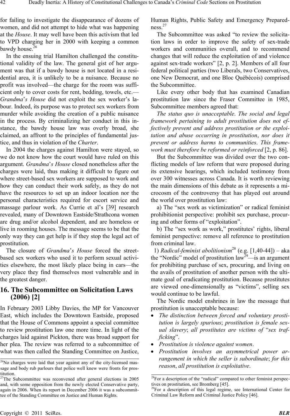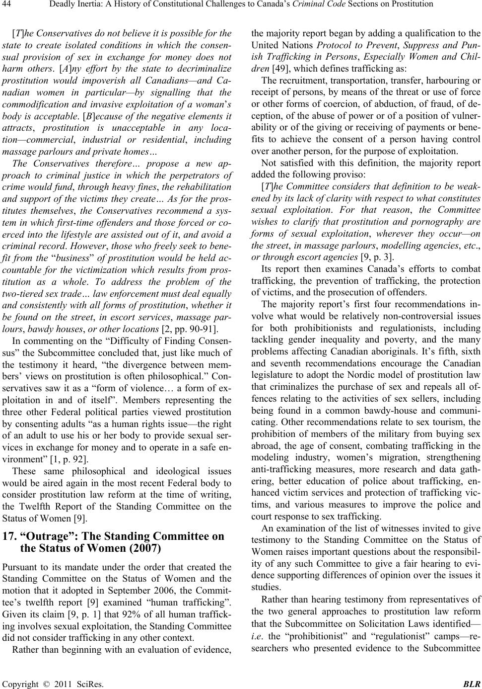 Deadly Inertia: A History of Constitutional Challenges to Canada’s Criminal Code Sections on Prostitution 44 [T]he Conservatives do not believe it is possible for the state to create isolated conditions in which the consen- sual provision of sex in exchange for money does not harm others. [A]ny effort by the state to decriminalize prostitution would impoverish all Canadians—and Ca- nadian women in particular—by signalling that the commodification and invasive exploitation of a woman’s body is acceptable. [B]ecause of the negative elements it attracts, prostitution is unacceptable in any loca- tion—commercial, industrial or residential, including massage parlours and private homes… The Conservatives therefore… propose a new ap- proach to criminal justice in which the perpetrators of crime would fund, through heavy fines, the rehabilitation and support of the victims they create… As for the pros- titutes themselves, the Conservatives recommend a sys- tem in which first-time offenders and those forced or co- erced into the lifestyle are assisted out of it, and avoid a criminal record. However, those who freely seek to bene- fit from the “business” of prostitution would be held ac- countable for the victimization which results from pros- titution as a whole. To address the problem of the two-tiered sex trade… law enforcement must deal equally and consistently with all forms of prostitution, whe ther i t be found on the street, in escort services, massage par- lours, bawdy houses, or other locations [2, pp. 90-91]. In commenting on the “Difficulty of Finding Consen- sus” the Subcommittee concluded that, just like much of the testimony it heard, “the divergence between mem- bers’ views on prostitution is often philosophical.” Con- servatives saw it as a “form of violence… a form of ex- ploitation in and of itself”. Members representing the three other Federal political parties viewed prostitution by consenting adults “as a human rights issue—the right of an adult to use his or her body to provide sexual ser- vices in exchange for money and to operate in a safe en- vironm ent ” [1, p. 9 2] . These same philosophical and ideological issues would be aired again in the most recent Federal body to consider prostitution law reform at the time of writing, the Twelfth Report of the Standing Committee on the Status of Women [9]. 17. “Outrage”: The Standing Committee on the Status of Women (2007) Pursuant to its mandate under the order that created the Standing Committee on the Status of Women and the motion that it adopted in September 2006, the Commit- tee’s twelfth report [9] examined “human trafficking”. Given its claim [9, p. 1] that 92% of all human traffick- ing involves sex ual exploitati on, the Standing Committee did not consider trafficking in any other context. Rather than beginning with an evaluation of evidence, the majority report began by adding a qualification to the United Nations Protocol to Prevent, Suppress and Pun- ish Trafficking in Persons, Especially Women and Chil- dren [49], which defines trafficking as: The recruitment, transpo rtation, transfer, harbouring or receipt of persons, by means of the threat or use of force or other forms of coercion, of abduction, of fraud, of de- ception, of the ab use of power or of a positio n of vulner- ability or of the giving or receiving of payments or bene- fits to achieve the consent of a person having control over another person, for the purpose of exploitation. Not satisfied with this definition, the majority report added the follo wi n g proviso: [T]he Committee considers that definition to be weak- ened by its lack of clarity with respect to what constitutes sexual exploitation. For that reason, the Committee wishes to clarify that prostitution and pornography are forms of sexual exploitation, wherever they occur—on the street, in massage parlours, modelling agencies, etc., or through escort agencies [9, p. 3]. Its report then examines Canada’s efforts to combat trafficking, the prevention of trafficking, the protection of victims, and the prosecution of offenders. The majority report’s first four recommendations in- volve what would be relatively non-controversial issues for both prohibitionists and regulationists, including tackling gender inequality and poverty, and the many problems affecting Canadian aboriginals. It’s fifth, sixth and seventh recommendations encourage the Canadian legislature to adopt the Nordic model of prostitution law that criminalizes the purchase of sex and repeals all of- fences relating to the activities of sex sellers, including being found in a common bawdy-house and communi- cating. Other recommendations relate to sex tourism, the prohibition of members of the military from buying sex abroad, the age of consent, combating trafficking in the modeling industry, women’s migration, strengthening anti-trafficking measures, more research and data gath- ering, better education of police about trafficking, en- hanced victim services and protection of trafficking vic- tims, and various measures to improve the police and court response to sex traf ficking. An examination of the list of witnesses invited to give testimony to the Standing Committee on the Status of Women raises important questions about the responsibil- ity of any such Committee to give a fair hearing to evi- dence supporting differences of opinion over the issues it studies. Rather than hearing testimony from representatives of the two general approaches to prostitution law reform that the Subcommittee on Solicitation Laws identified— i.e. the “prohibitionist” and “regulationist” camps—re- searchers who presented evidence to the Subcommittee Copyright © 2011 SciRes. BLR