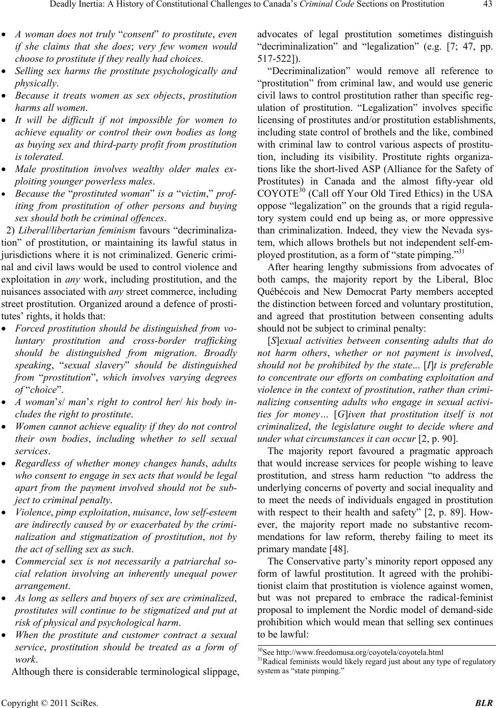 Deadly Inertia: A History of Constitutional Challenges to Canada’s Criminal Code Sections on Prostitution43 A woman does not truly “consent” to prostitute, even if she claims that she does; very few women would choose to prostitute if they really h ad choices. Selling sex harms the prostitute psychologically and physically. Because it treats women as sex objects, prostitution harms all women. It will be difficult if not impossible for women to achieve equality or control their own bodies as long as buying sex and third-party profit from prostitution is tolerated. Male prostitution involves wealthy older males ex- ploiting younger powerless males. Because the “prostituted woman” is a “victim,” prof- iting from prostitution of other persons and buying sex should both be criminal offences. 2) Liberal/libertarian feminism favours “decriminaliza- tion” of prostitution, or maintaining its lawful status in jurisdictions where it is not criminalized. Generic crimi- nal and civil laws would be used to control violence and exploitation in any work, including prostitution, and the nuisances associated with any street commerce, including street prostitution. Organized around a defence of prosti- tutes’ rights, it holds that: Forced prostitution should be distinguished from vo- luntary prostitution and cross-border trafficking should be distinguished from migration. Broadly speaking, “sexual slavery” should be distinguished from “prostitution”, which involves varying degrees of “choice”. A woman’s/ man’s right to control her/ his body in- cludes the right to pros titute. Women cannot achieve equality if they do not control their own bodies, including whether to sell sexual services. Regardless of whether money changes hands, adults who consent to engage in sex acts that would be legal apart from the payment involved should not be sub- ject to criminal penalty. Violence, pimp exploitation, nuisance, low self-esteem are indirectly caused by or exacerbated by the crimi- nalization and stigmatization of prostitution, not by the act of selling sex as such. Commercial sex is not necessarily a patriarchal so- cial relation involving an inherently unequal power arrangement. As long as sellers and buyers of sex are criminalized, prostitutes will continue to be stigmatized and put at risk of physical and psychological harm. When the prostitute and customer contract a sexual service, prostitution should be treated as a form of work. Although there is cons iderable terminological slippage, advocates of legal prostitution sometimes distinguish “decriminalization” and “legalization” (e.g. [7; 47, pp. 517-522]). “Decriminalization” would remove all reference to “prostitution” from criminal law, and would use generic civil laws to control prostitution rather than specific reg- ulation of prostitution. “Legalization” involves specific licensing of prostitutes and/or pro stitution establishments, including state control of brothels and the like, combined with criminal law to control various aspects of prostitu- tion, including its visibility. Prostitute rights organiza- tions like the short-lived ASP (Alliance for the Safety of Prostitutes) in Canada and the almost fifty-year old COYOTE30 (Call off Your Old Tired Ethics) in the USA oppose “legalization” on the grounds that a rigid regula- tory system could end up being as, or more oppressive than criminalization. Indeed, they view the Nevada sys- tem, which allows brothels but not independent self-em- ployed prostitution, as a form of “state pimping.”31 After hearing lengthy submissions from advocates of both camps, the majority report by the Liberal, Bloc Québécois and New Democrat Party members accepted the distinction between forced and voluntary prostitution , and agreed that prostitution between consenting adults should not be subject to criminal penalty: [S]exual activities between consenting adults that do not harm others, whether or not payment is involved, should not be prohibited by the state... [I]t is preferable to concentrate our efforts on combating exploitation and violence in the context of prostitution, rather than crimi- nalizing consenting adults who engage in sexual activi- ties for money… [G]iven that prostitution itself is not criminalized, the legislature ought to decide where and under what circumstances it can occur [2, p. 90]. The majority report favoured a pragmatic approach that would increase services for people wishing to leave prostitution, and stress harm reduction “to address the underlying concerns of poverty and social inequa lity and to meet the needs of individuals engaged in prostitution with respect to their health and safety” [2, p. 89]. How- ever, the majority report made no substantive recom- mendations for law reform, thereby failing to meet its primary mandate [48]. The Conservative party’s minority report opposed any form of lawful prostitution. It agreed with the prohibi- tionist claim that prostitution is violence against women, but was not prepared to embrace the radical-feminist proposal to implement the Nordic model of demand-side prohibition which would mean that selling sex continues to be lawful: 30See http://www.freedomusa.org/coyotela/coyotela.html 31Radical feminists would likely regard just about any type of regulatory system as “state pimping.” Copyright © 2011 SciRes. BLR