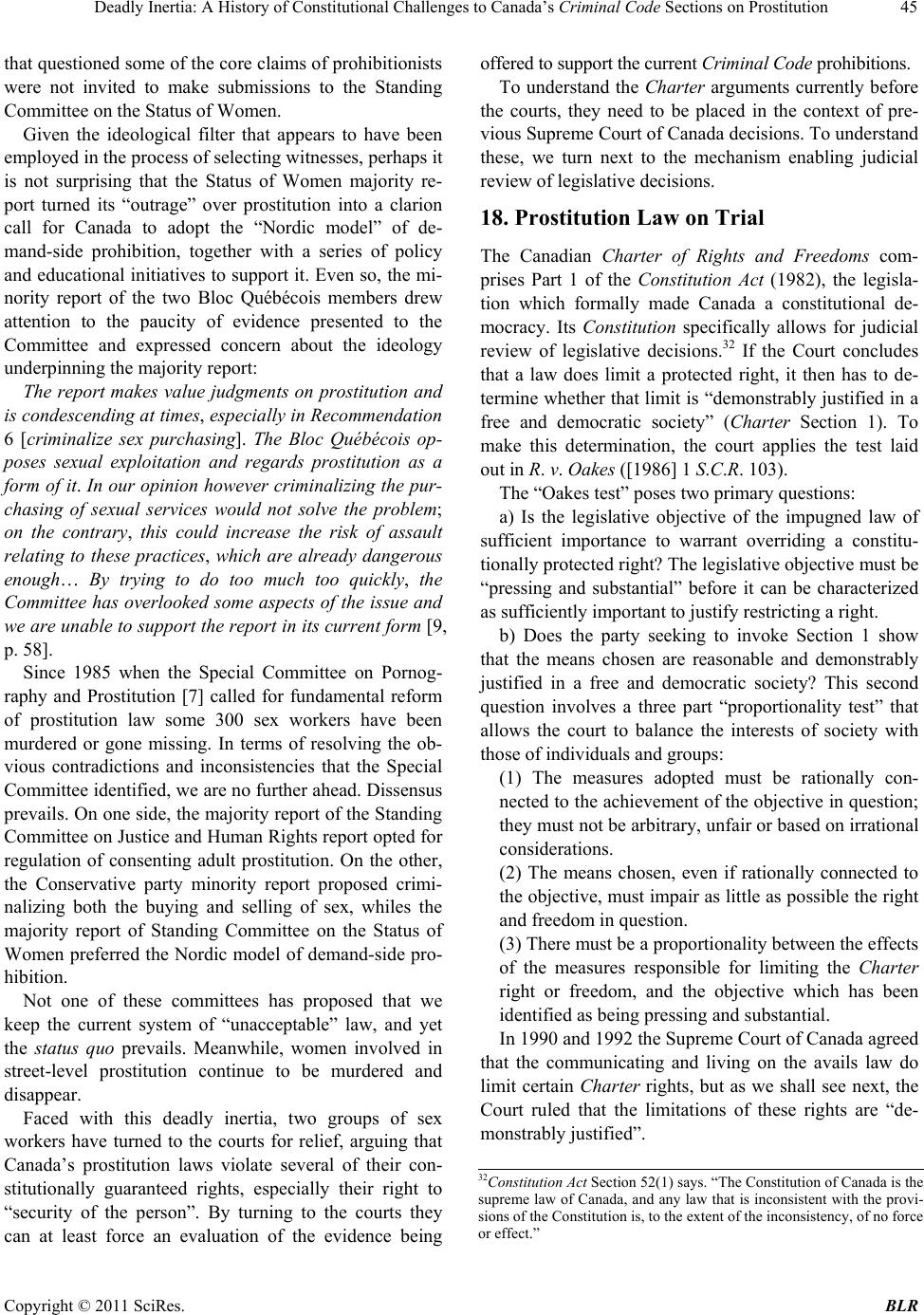 Deadly Inertia: A History of Constitutional Challenges to Canada’s Criminal Code Sections on Prostitution45 that questioned some of th e core claims of prohibition ists were not invited to make submissions to the Standing Committee on the Status of Women. Given the ideological filter that appears to have been employed in the process of selecting witnesses, perhaps it is not surprising that the Status of Women majority re- port turned its “outrage” over prostitution into a clarion call for Canada to adopt the “Nordic model” of de- mand-side prohibition, together with a series of policy and educational initiatives to support it. Even so, the mi- nority report of the two Bloc Québécois members drew attention to the paucity of evidence presented to the Committee and expressed concern about the ideology underpinning the majority report: The report makes value judgments on prostitution and is condescending at times, especially in Recommendation 6 [criminalize sex purchasing]. The Bloc Québécois op- poses sexual exploitation and regards prostitution as a form of it. In our opinion however criminalizing the pur- chasing of sexual services would not solve the problem; on the contrary, this could increase the risk of assault relating to these practices, which are already dangerous enough… By trying to do too much too quickly, the Committee has overlooked some aspects of the issue and we are unable to suppo rt the report in its current form [9, p. 58]. Since 1985 when the Special Committee on Pornog- raphy and Prostitution [7] called for fundamental reform of prostitution law some 300 sex workers have been murdered or gone missing. In terms of resolving the ob- vious contradictions and inconsistencies that the Special Committee identified, we are no further ahead. Dissensus prevails. On one side, the majority report of the Stand ing Committee on Justice and Human Rights report opted for regulation of consenting adult prostitution. On the other, the Conservative party minority report proposed crimi- nalizing both the buying and selling of sex, whiles the majority report of Standing Committee on the Status of Women preferred the Nordic model of demand-side pro- hibition. Not one of these committees has proposed that we keep the current system of “unacceptable” law, and yet the status quo prevails. Meanwhile, women involved in street-level prostitution continue to be murdered and disappear. Faced with this deadly inertia, two groups of sex workers have turned to the courts for relief, arguing that Canada’s prostitution laws violate several of their con- stitutionally guaranteed rights, especially their right to “security of the person”. By turning to the courts they can at least force an evaluation of the evidence being offered to support the current Cri minal C ode prohibi t ions. To understand the Ch arter arguments currently before the courts, they need to be placed in the context of pre- vious Supreme Court of Canada decisions. To understand these, we turn next to the mechanism enabling judicial review of legislative decisions. 18. Prostitution Law on Trial The Canadian Charter of Rights and Freedoms com- prises Part 1 of the Constitution Act (1982), the legisla- tion which formally made Canada a constitutional de- mocracy. Its Constitution specifically allows for judicial review of legislative decisions.32 If the Court concludes that a law does limit a protected right, it then has to de- termine whether that limit is “demonstrably justified in a free and democratic society” (Charter Section 1). To make this determination, the court applies the test laid out in R. v. Oakes ([1986] 1 S.C.R. 103). The “Oakes test” poses two primary questions: a) Is the legislative objective of the impugned law of sufficient importance to warrant overriding a constitu- tionally protected right? Th e legislative objective must be “pressing and substantial” before it can be characterized as sufficiently important to justify restricting a right. b) Does the party seeking to invoke Section 1 show that the means chosen are reasonable and demonstrably justified in a free and democratic society? This second question involves a three part “proportionality test” that allows the court to balance the interests of society with those of individuals and groups: (1) The measures adopted must be rationally con- nected to the achievement of the objective in question; they must not be arbitrary, unfair or based on irrational considerations. (2) The means chosen, even if rationally connected to the objective, must impair as little as possible the right and freedom in question. (3) There must be a proportion ality b etween the effects of the measures responsible for limiting the Charte r right or freedom, and the objective which has been identified as being pressing and substantial. In 1990 and 1992 the Supreme Court of Canada agreed that the communicating and living on the avails law do limit certain Charter rights, but as we shall see next, the Court ruled that the limitations of these rights are “de- monstrably justified”. 32Constitution ActSection 52(1) says. “The Constitution of Canada is the supreme law of Canada, and any law that is inconsistent with the provi- sions of the Constitution is, to the extent of the inconsistency, of no force or effect.” Copyright © 2011 SciRes. BLR