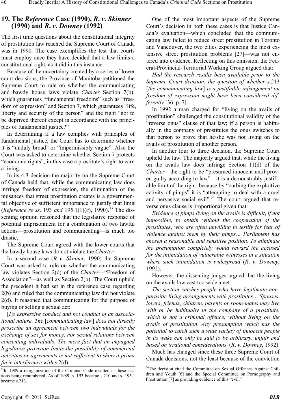 Deadly Inertia: A History of Constitutional Challenges to Canada’s Criminal Code Sections on Prostitution 46 19. The Reference Case (1990), R. v. Skinner (1990) and R. v. Downey (1992) The first time questions about th e constitutional integrity of prostitution law reach ed the Supreme Court of Can ada was in 1990. The case exemplifies the test that courts must employ once they have decided that a law limits a constitutional righ t, as it did in this instance. Because of the uncertainty created by a series of lower court decisions, the Province of Manitoba petitioned the Supreme Court to rule on whether the communicating and bawdy house laws violate Charter Section 2(b), which guarantees “fundamental freedoms” such as “free- dom of expression” and Section 7, which guarantees “life, liberty and security of the person” and the right “not to be deprived thereof except in accordance with the princi- ples of fundamental justice?” In determining if a law complies with principles of fundamental justice, the Court has to determine whether it is “unduly broad” or “impermissibly vague”. Also the Court was asked to determine whether Section 7 protects “economic rights”, in this case a prostitute’s right to earn a living. In its 4:3 decision the majority on the Supreme Court of Canada held that, while the communicating law does infringe freedom of expression, the elimination of the nuisances that street prostitution creates is a governmen- tal objective of sufficient importance to justify that limit (Reference re ss. 193 and 195.1(1)(c), 1990).33 The dis- senting opinion reasoned that the legislative response of potential imprisonment for a combination of two lawful actions—prostitution and communicating—is much too drastic. The Supreme Court agreed with the lower courts that the bawdy house laws do not violate the Charter. In a second case (R v. Skinner, 1990) the Supreme Court was asked to rule on whether the communicating law violates Section 2(d) of the Charter—“Freedom of Association”—as well as Section 2(b). The Court upheld the precedent it had set in the reference case regarding 2(b) and ruled that the communicating law did not violate 2(d). It reasoned that communicating for the purpose of buying or selling a sexual act: [I]s expressive conduct and not conduct of an associa- tional nature. The [communicating la w] does not directly proscribe an agreement between two individuals for the exchange of sex for money, nor sexual relations between consenting individuals. The mere fact that an impugned legislative provision limits the possibility of commercial activities or agreements is n ot sufficient to show a prima facie interference with s.2(d). One of the most important aspects of the Supreme Court’s decision in both these cases is that Justice Can- ada’s evaluation—which concluded that the communi- cating law failed to reduce street prostitution in Toronto and Vancouver, the two cities experiencing the most ex- tensive street prostitution problems [27]—was not en- tered into evidence. Reflecting on this omission, the Fed- eral-Provincial-Territorial Working Group argued that: Had the research results been available prior to the Supreme Court decision, the question of whether s.213 [the communicating law] is a justifiable infringement on freedom of expression might have been considered dif- ferently [36, p. 7]. In 1992 a man charged for “living on the avails of prostitution” challenged the constitutional validity of the “reverse onus” clause of that law; if a person is habitu- ally in the company of prostitutes the onus switches to that person to prove that he/she was not living on the avails of prostitution of another person. In another four to three decision, the Supreme Court upheld the law. The majority argued that, while th e living on the avails law does infringe Section 11(d) of the Charter—the right to be “presumed innocent until prov- en guilty according to law”—it is a demonstrably justifi- able limit of the right, because b y “curbing the exploitiv e activity of pimps” it is “attempting to deal with a cruel and pervasive social evil”.34 The court argued that re- verse onus clause is proportional given that: Evidence of pimps living on the avails is difficu lt, if not impossible, to obtain without the cooperation of the prostitutes, who are often unwilling to testify for fear of violence against them by their pimps… Parliament has chosen a reasonable and sensitive position. To eliminate the presumption completely would reward the accused for the intimidation of vu lnerable witnesses in a situation where such intimidation is widespread (R. v. Downey, 1992). However, the dissenting judges argued that the living on the avails law cast too wide a net: The section catches people who have legitimate non- parasitic living ar rangements with prostitutes… Spou ses, lovers, friends, children, parents or room-mates may live with or be habitually in the company of a prostitute, which is not a criminal offence, without living on the avails of prostitution. Any presumption which has the potential to catch such a wide variety of innocent people in its wake can only be said to be arbitrary, unfair and based on irrational consideratio ns. (R. v. Downey, 1992) Much has changed since these three Supreme Court of Canada decisions, not the least because of the conviction 34The decision cited the Committee on Sexual Offences Against Chil- dren and Youth [6] and the Special Committee on Pornography and Prostitution [7] as providing evidence of this “evil.” 33In 1989 a reorganization of the Criminal Code resulted in these sec- tions being renumbered. As of 1989, s. 193 became s.210 and s. 195.1 became s.213. Copyright © 2011 SciRes. BLR