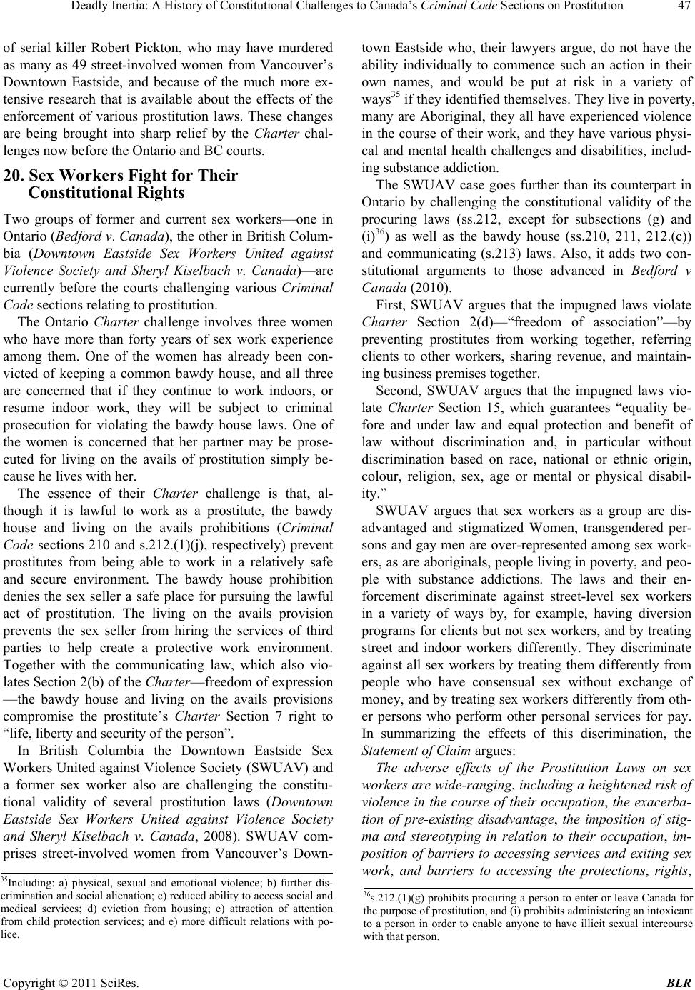 Deadly Inertia: A History of Constitutional Challenges to Canada’s Criminal Code Sections on Prostitution47 of serial killer Robert Pickton, who may have murdered as many as 49 street-involved women from Vancouver’s Downtown Eastside, and because of the much more ex- tensive research that is available about the effects of the enforcement of various prostitution laws. These changes are being brought into sharp relief by the Charter chal- lenges now before the Ontario and BC courts. 20. Sex Workers Fight for Their Constitutional Rights Two groups of former and current sex workers—one in Ontario (Bedford v. Canada), the other in British Colum- bia (Downtown Eastside Sex Workers United against Violence Society and Sheryl Kiselbach v. Canada)—are currently before the courts challenging various Criminal Code sections relating to prostitution. The Ontario Charter challenge involves three women who have more than forty years of sex work experience among them. One of the women has already been con- victed of keeping a common bawdy house, and all three are concerned that if they continue to work indoors, or resume indoor work, they will be subject to criminal prosecution for violating the bawdy house laws. One of the women is concerned that her partner may be prose- cuted for living on the avails of prostitution simply be- cause he lives with her. The essence of their Charter challenge is that, al- though it is lawful to work as a prostitute, the bawdy house and living on the avails prohibitions (Criminal Code sections 210 and s.212.(1)(j), respectively) prevent prostitutes from being able to work in a relatively safe and secure environment. The bawdy house prohibition denies the sex seller a safe place for pursuing the lawful act of prostitution. The living on the avails provision prevents the sex seller from hiring the services of third parties to help create a protective work environment. Together with the communicating law, which also vio- lates Section 2(b) of the Charter—freedom of expression —the bawdy house and living on the avails provisions compromise the prostitute’s Charter Section 7 right to “life, liberty and security of the person”. In British Columbia the Downtown Eastside Sex Workers United against Violence Society (SWUAV) and a former sex worker also are challenging the constitu- tional validity of several prostitution laws (Downtown Eastside Sex Workers United against Violence Society and Sheryl Kiselbach v. Canada, 2008). SWUAV com- prises street-involved women from Vancouver’s Down- town Eastside who, their lawyers argue, do not have the ability individually to commence such an action in their own names, and would be put at risk in a variety of ways35 if they identified themselves. They live in poverty, many are Aboriginal, they all have experienced violence in the course of their work, and they have various physi- cal and mental health challenges and disabilities, includ- ing s ubstance addiction. The SWUAV case goes further than its counterpart in Ontario by challenging the constitutional validity of the procuring laws (ss.212, except for subsections (g) and (i)36) as well as the bawdy house (ss.210, 211, 212.(c)) and communicating (s.213) laws. Also, it adds two con- stitutional arguments to those advanced in Bedford v Canada (2010). First, SWUAV argues that the impugned laws violate Charter Section 2(d)—“freedom of association”—by preventing prostitutes from working together, referring clients to other workers, sharing revenue, and maintain- ing business premi ses together. Second, SWUAV argues that the impugned laws vio- late Charter Section 15, which guarantees “equality be- fore and under law and equal protection and benefit of law without discrimination and, in particular without discrimination based on race, national or ethnic origin, colour, religion, sex, age or mental or physical disabil- ity.” SWUAV argues that sex workers as a group are dis- advantaged and stigmatized Women, transgendered per- sons and gay men are ov er-represented among sex work- ers, as are aboriginals, people living in poverty, and peo- ple with substance addictions. The laws and their en- forcement discriminate against street-level sex workers in a variety of ways by, for example, having diversion programs for clients but not sex workers, and by treating street and indoor workers differently. They discriminate against all sex workers by treating them differently from people who have consensual sex without exchange of money, and by treating sex workers differently from oth- er persons who perform other personal services for pay. In summarizing the effects of this discrimination, the Statement of Claim argues: The adverse effects of the Prostitution Laws on sex workers are wide-ranging, including a heightened risk of violence in the course of their occupation, the exacerba- tion of pre-existing disadvantage, the imposition of stig- ma and stereotyping in relation to their occupation, im- position of barriers to accessing services and exiting sex work, and barriers to accessing the protections, rights, 35Including: a) physical, sexual and emotional violence; b) further dis- crimination and social alienation; c) reduced ability to access social and medical services; d) eviction from housing; e) attraction of attention from child protection services; and e) more difficult relations with po- lice. 36s.212.(1)(g) prohibits procuring a person to enter or leave Canada for the purpose of prostitution, and (i) prohibits administering an intoxicant to a person in order to enable anyone to have illicit sexual intercourse with that person. Copyright © 2011 SciRes. BLR