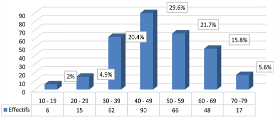 304 cases of breast cancer were recruited during our study. The average age was 48.05 years ± 2.6 years with a minimum age of 18 and a maximum age of 80. The modal class was [40 - 49] corresponding to a population of 90 cases (29.6%) (Figure 1).