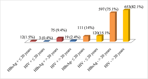The average age of HIV and HBV patients was 25.7 and 26.2 years, respectively. Figure 1 shows the distribution by age group.