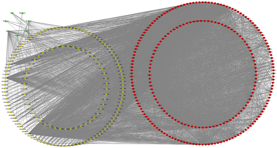 Drug-compound-target network of Shufeng Jiedu Capsule includes 400 nodes, 7756 edges, 8 TCM, 155 active compounds, 236 targets. As shown in Figure 1, green—TCM, yellow—compounds, red—targets. Our study also selected key nods according to degree of topological analysis, including 3 TCM, 45 targets, 26 compounds (shown in Table 1).