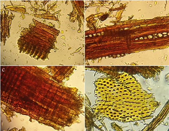 Figure 5. Cork in surface view fibres (A), part of xylem showing parenchymatous cells, group of fibers with prisms of calcium oxalate (B), fragment of parenchyma (C), pitted vessels (D) of Pterocarpus soyauxii (10×).