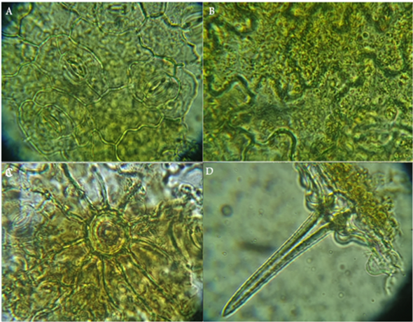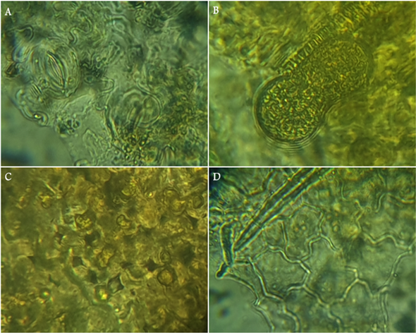 Figure 7. Secretory cells (A), upper epidermis showing wavy anticlinal cell walls (B), lower epidermis with diacytic stomata (C), pluricelluar non-glandular trichomes (D) of Tetradenia riparia (40×).