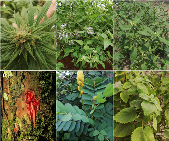 Figure 1. Studied plants (A) Cannabis sativa L., (B) Chromolaena odorata (L.) R. King & H. Rob., (C) Mitracarpus villosus (Sw.) DC., (D) Pterocarpus soyauxii, (E) Senna (Cassia) alata (L.) Roxb., (F) Tetradenia riparia (Hochst.) Codd.