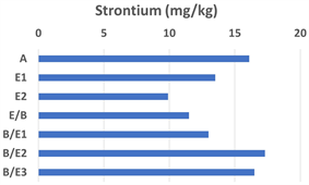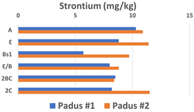 Figure 5. (a) Strontium (Sr) aqua regia digestion concentrations for the Padus soil series; (b) Strontium (Sr) aqua regia digestion concentrations for the Sporley-like soil series.