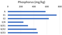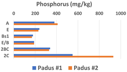 Figure 6. (a) Phosphorus (P) aqua regia digestion concentrations for the Padus soil series; (b) Phosphorus (P) aqua regia digestion concentrations for the Sporley-like soil series.