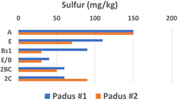Figure 7. (a) Sulfur (S) aqua regia digestion concentrations for the Padus soil series; (b) Sulfur (S) aqua regia digestion concentrations for the Sporley-like soil series.