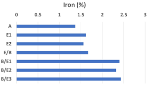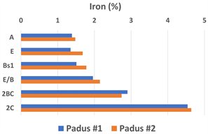 Figure 8. (a) Iron (Fe) aqua regia digestion concentrations for the Padus soil series; (b) Iron (Fe) aqua regia digestion concentrations for the Sporley-like soil series.