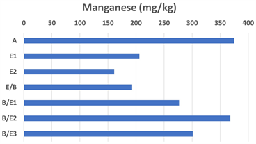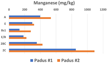 Figure 9. (a) Manganese (Mn) aqua regia digestion concentrations for the Padus soil series; (b) Manganese (Mn) aqua regia digestion concentrations for the Sporley-like soil series.