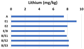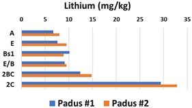 Figure 1. (a) Lithium (Li) aqua regia digestion concentrations for the Padus soil series; (b) Lithium (Li) aqua regia digestion concentrations for the Sporley-like soil series.