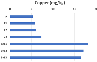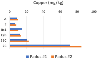 Figure 10. (a) Copper (Cu) aqua regia digestion concentrations for the Padus soil series; (b) Copper (Cu) aqua regia digestion concentrations for the Sporley-like soil series.