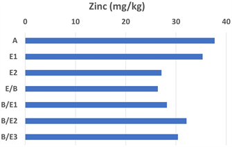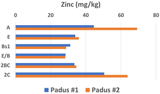 Figure 11. (a) Zinc (Zn) aqua regia digestion concentrations for the Padus soil series; (b) Zinc (Zn) aqua regia digestion concentrations for the Sporley-like soil series.