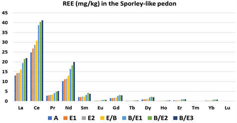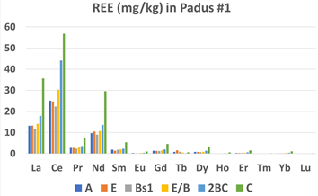 For all pedons, the LREE’s exhibit greater abundances than the HREE’s, a feature attributed to the greater abundance of LREE-bearing minerals and the more efficient aqua regia digestion recovery of the LREE’s (Table 8). Each of the 14 REE’s exhibit greater concentrations on progression from the A horizon through the Bs horizon to the deeper 2C (Padus) or B/E horizons (Sporley-like pedon) (Figures 13(a)-(c)). The pH dependent mobility of the REE’s in soil has been