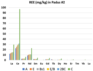 Figure 13. (a) Rare earth elements (REE) aqua regia digestion concentrations for the Padus #1 soil series; (b) Rare earth elements (REE) aqua regia digestion concentrations for the Padus #2 soil series; (c) Rare earth elements (REE) aqua regia digestion concentrations for the Sporley-like soil series.