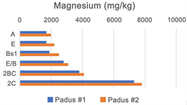 Figure 3. (a) Magnesium (Mg) aqua regia digestion concentrations for the Padus soil series; (b) Magnesium (Mg) aqua regia digestion concentrations for the Sporley-like soil series.