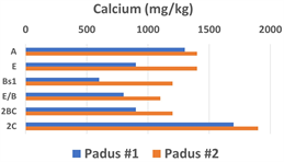 Figure 4. (a) Calcium (Ca) aqua regia digestion concentrations for the Padus soil series; (b) Calcium (Ca) aqua regia digestion concentrations for the Sporley-like soil series.