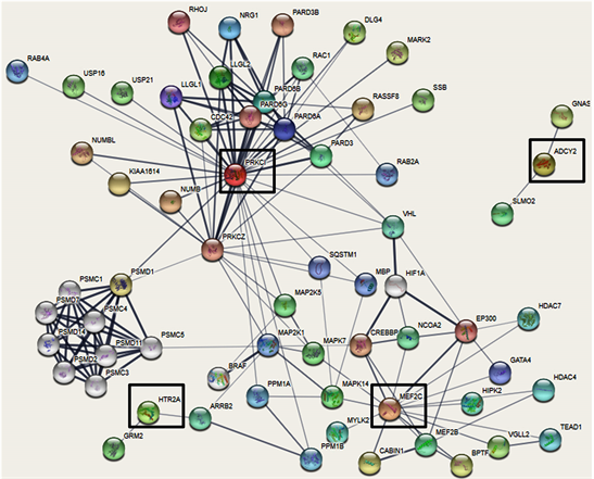 A protein interaction network (refer to Figure 7) was generated with the input genes ADCY2,HTR2A,MEF2C,CAMK2A,HTR4,SLC22A5,SERPINF1,NPY,and PRKCI. The network contained 50 and 10 interactors in the first and second shells, respectively, and its clusters centered on the following genes (in decreasing order of cluster size, measured by number of direct interactions): PRKCI (21 first shell interactions), CAMK2A (15 first shell interactions), PSMD1 (2 first shell interactions and 8 second shell interactions), MEF2C (8 first shell interactions), NPY and ADCY2 (each with 2 first shell interactions), SERPINF1 and HTR2A (each with 1 first shell interaction), and HTR4 and SLC22A5 (each with no interactions).