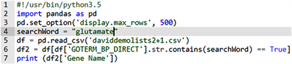 Figure 4. Python script used for the keyword search in the DAVID bioinformatics database, with an example containing the search word “glutamate” shown above.
