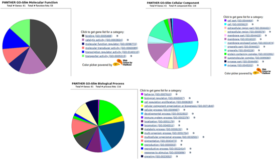 Figure 6. Molecular Function, Cellular Component, and Biological Process pie charts, respectively, generated through The Gene Ontology and the PANTHER classification system.