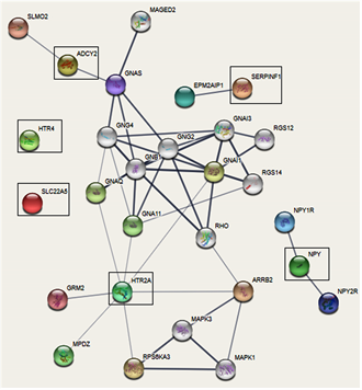 The second protein interaction network (refer to Figure 8) revealed that HTR2A was indirectly associated with ADCY2 through several members of the guanine nucleotide-binding protein subunit group (e.g., GNAI1). However, NPY, SERPINF1, HTR4, and SLC22A5 did not display any new or different interactions than in Figure 7. Given that the cluster centered around HTR2A contained members of the MAPK family (MAPK1 and MAPK3), another protein network analysis was conducted to investigate any other possible proteins interactions between HTR2A, ADCY2, and the original input genes most directly associated with the MAPK family (PRKCI, CAMK2A, and MEF2C), as revealed in Figure 7.