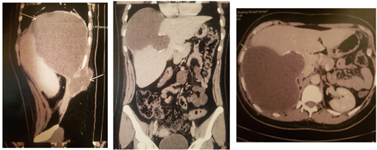 Figure 1. A computed tomography scan (CT) revealed a large cystic liver lesion interesting the right liver extending to involve right lateral chest wall forming a collection in an intermuscular.