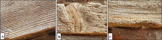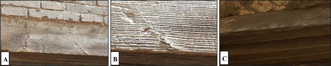 A remarkable erosion was noticed in the lintel edges, especially the parts adjacents to the wall. This loss in these parts can be explained as follows: the wooden lintels are in direct contact with the walls and absorb water mixed with salts and other large quantities of soluble building materials. Because of high temperature, these materials crystallize on the surface, and between the fibers and with the effect of wind, these materials fall out with some parts of the fragile wood from the surface (Figure 9(C)).