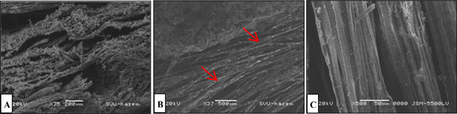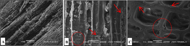 Figure 10. SEM micrographs of the door lintel in the mausoleum dome chamber, (A) a longitudinal section showing the fragile and detached wood fibers, (B,C) a longitudinal section showing the detached wood tracheids. (bar: (A) 200 μm, (b) 500 μm, (C) 50 μm).