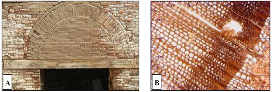 Figure 4. (A). The windows lintels in the outer portico and in the entry corridor of Fatma Khatun mausoleum, (B). A cross-section of the pine wood (digital microscope).