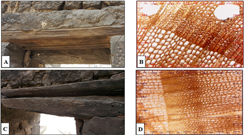 The pine wood (Pinussp.) was used in the mausoleum of Fatma Khatun to make the lintels of the main door of the mausoleum dome chamber (Figure 3(A)), also it was used to make the window lintels in the outer portico and in the entry corridor of this mausoleum (Figure 4(A), Figure 5(A) & Figure 5(C)).